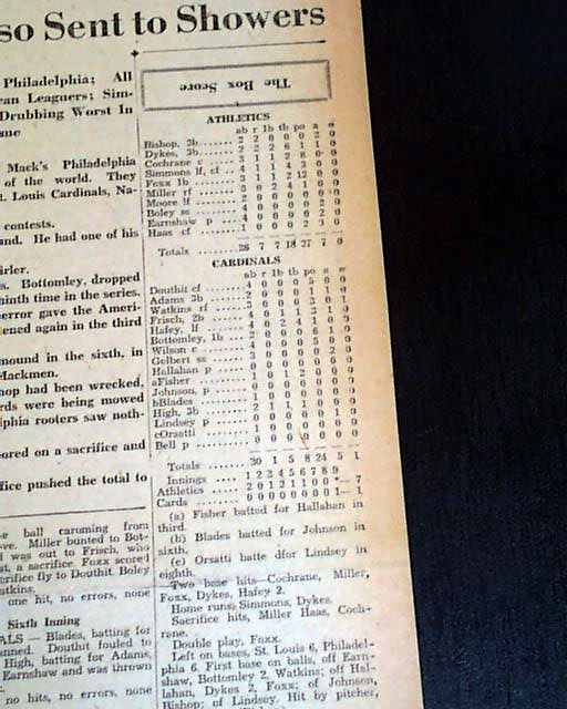 The front page has a nice banner headline: "Athletics Retain Championship" with subheads, box scores and inning by inning descriptions. Unusual to have all of this on the front page, nice for display as such. First report coverage on the Philadelphia Athletics winning the 1930 World Series.