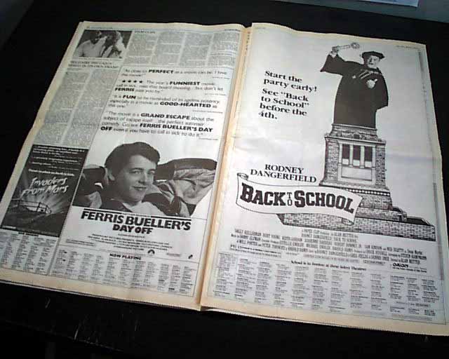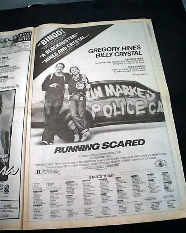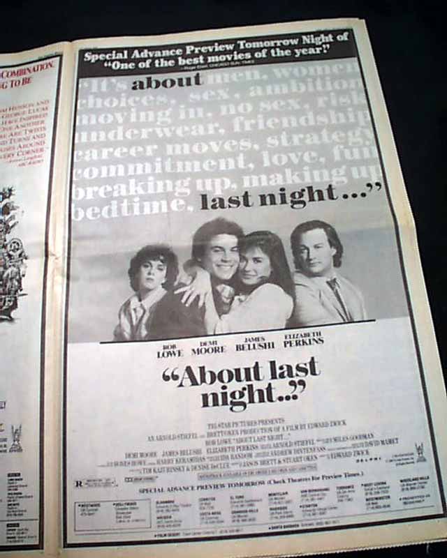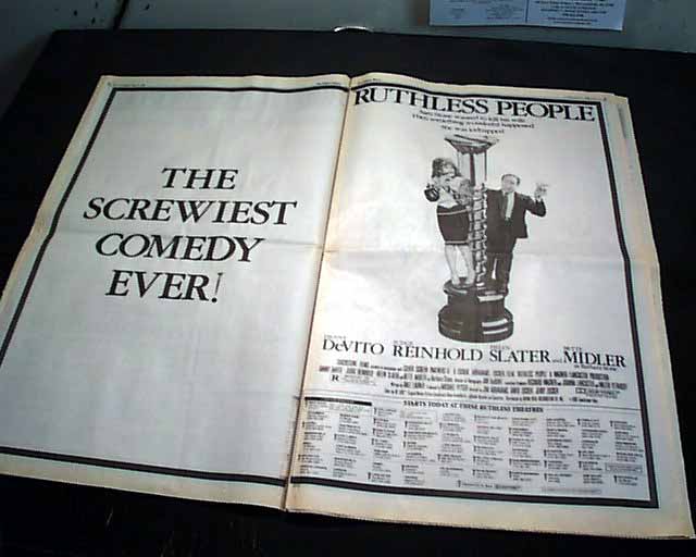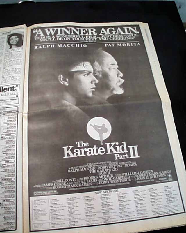 Also included are large or full-page ads for: "The Karate Kid II", "American Anthem" (the premier), "Legal Eagles" (premiered 2 days prior), "Ruthless People" (the premier), "Running Scared" (the premier), "Back To School", and "About Last Night".