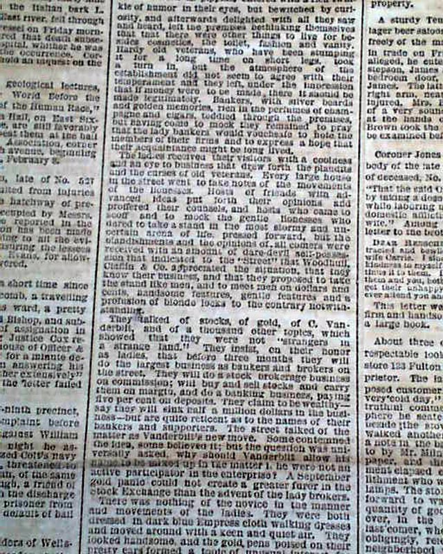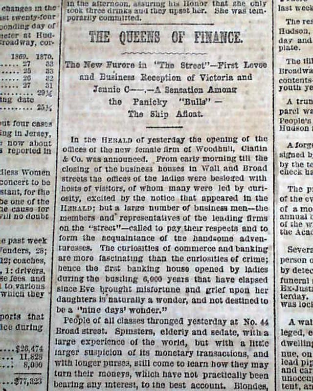 Under the column heads: "THE QUEENS OF FINANCE" "The New Furore in 'The Street'--First Levee and Business Reception of Victoria and Tennie C.--,--A Sensation Among the Panicky 'Bulls'--The Ship Afloat" is the report of Victoria Woodhull and her sister, Tennessee (Tennie) Claflin, being the first woman to open a brokerage firm on Wall Street.