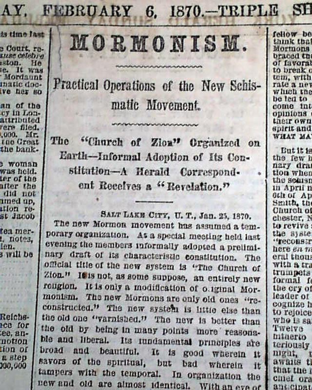Page 4 has nearly 2 columns taken u with: "MORMONISM" "Practical Operations of the New Schismatic Movement" "The 'Church of Zion' Organized on Earth--Informal Adoption of Its Constitution--A Herald Correspondent Receives a 'Revelation' ".