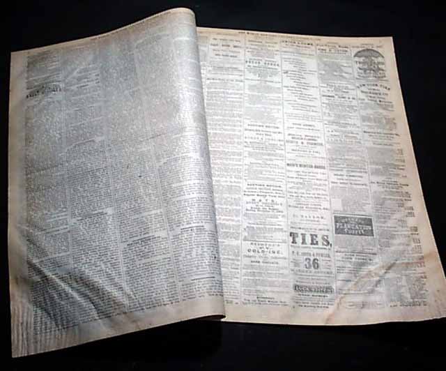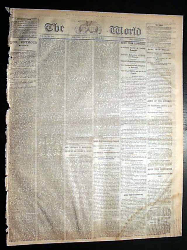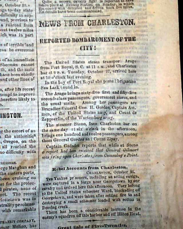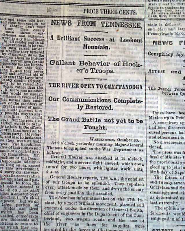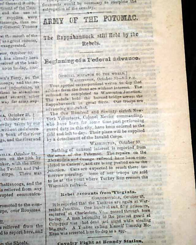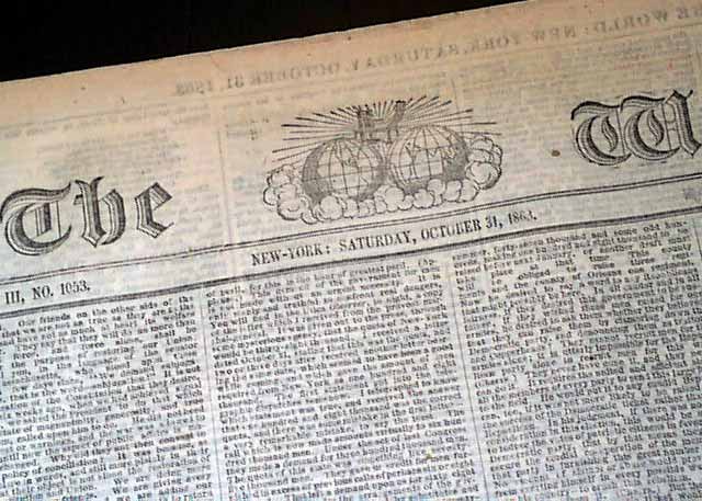 THE WORLD, New York, Oct. 31, 1863 Among the front page column heads on the Civil War are: "A Brilliant Success at Lookout Mountain" "Gallant Behavior of Hooker's Troops" "The Rappahannock still Held by the Rebels" "News From Charleston--Reported Bombardment of the City!" and more.