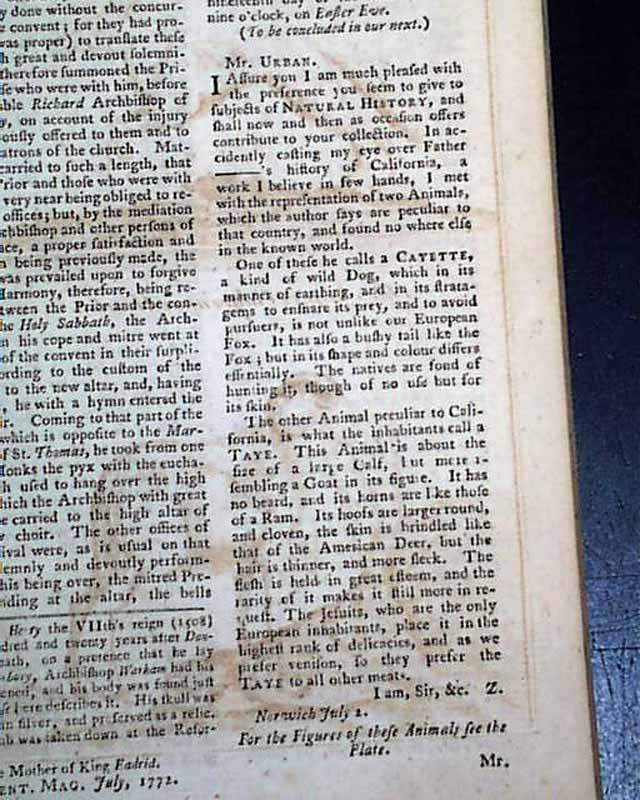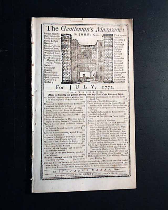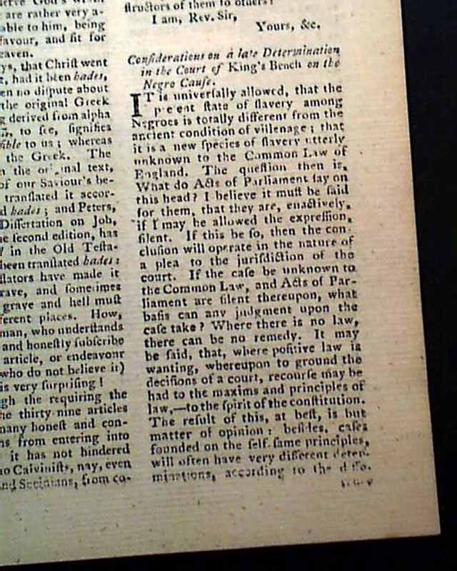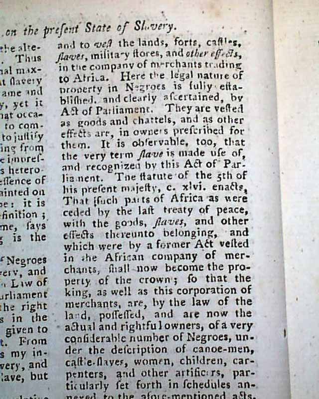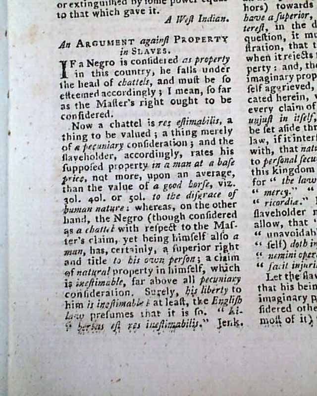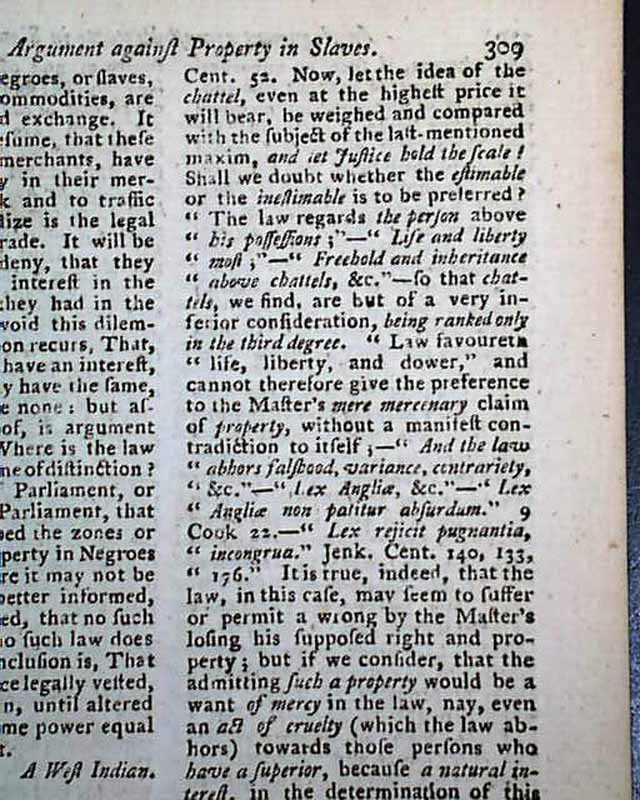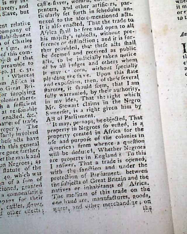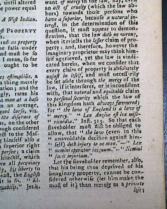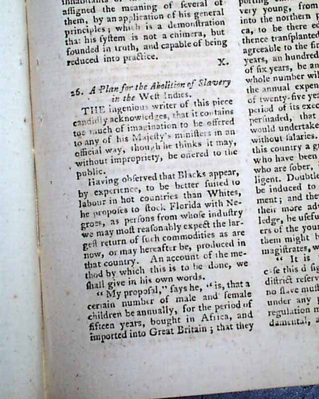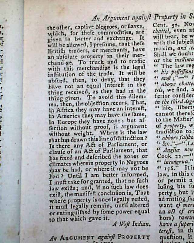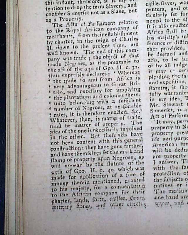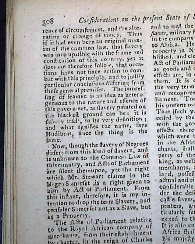 THE GENTLEMAN'S MAGAZINE, London, July, 1772  The most significant articles in this issue would be two which are follow-up commentaries concerning the landmark James Somersett slave case. Somerset was a slave purchased in Virginia then taken to England, escaped & eventually recaptured. This case concerned whether he was free or remained a slave and ultimately determined that slavery was unsupported in England. The articles are titled "Considerations on a Late Determination in the Court of King's Bench on the Negro Cause" which is a direct reference to the Somersett case which was just decided on June 22 and takes over a full page. This is followed by: "An Argument Against Property in Slaves" which relates to the Somersett case as well. Further on is: "A Plan for the Abolition of Slavery in the West Indies".