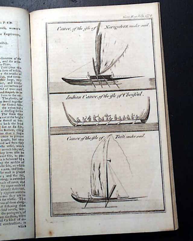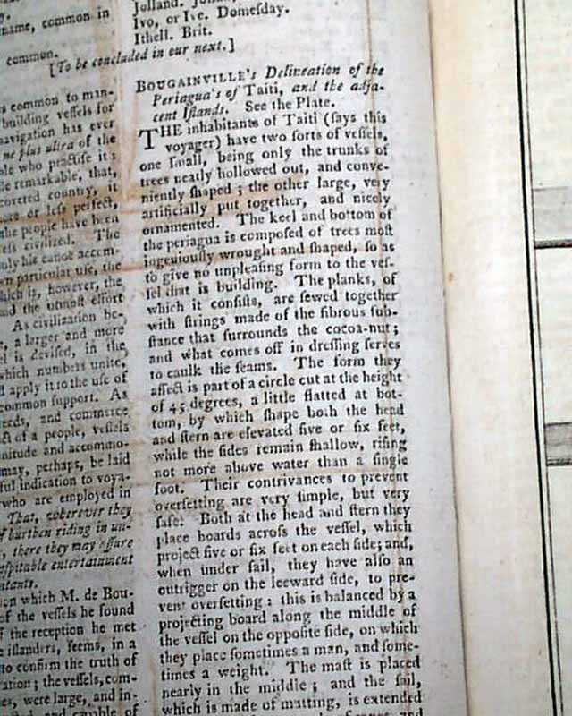 Also in this issue is "Bougainville's Delineation of the Periagua's of Taiti [Tahiti], and the Adjacent Islands". It accompanies a related full page plate of canoes of Tahiti. Bougainville was a French explorer who circumnavigated the world, and who explored Tahiti.