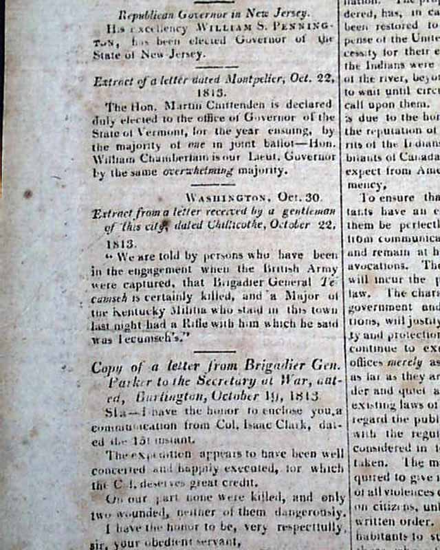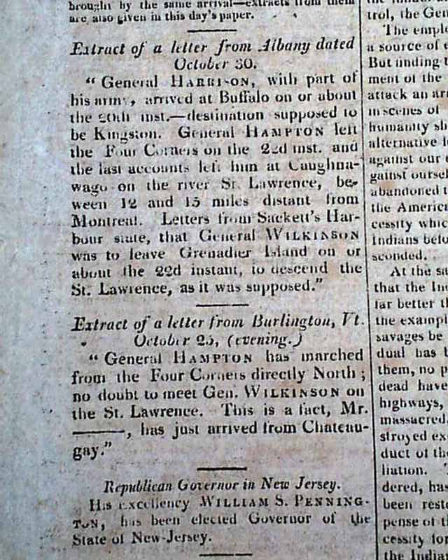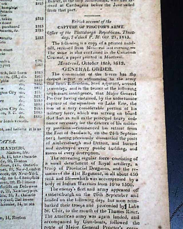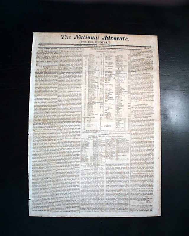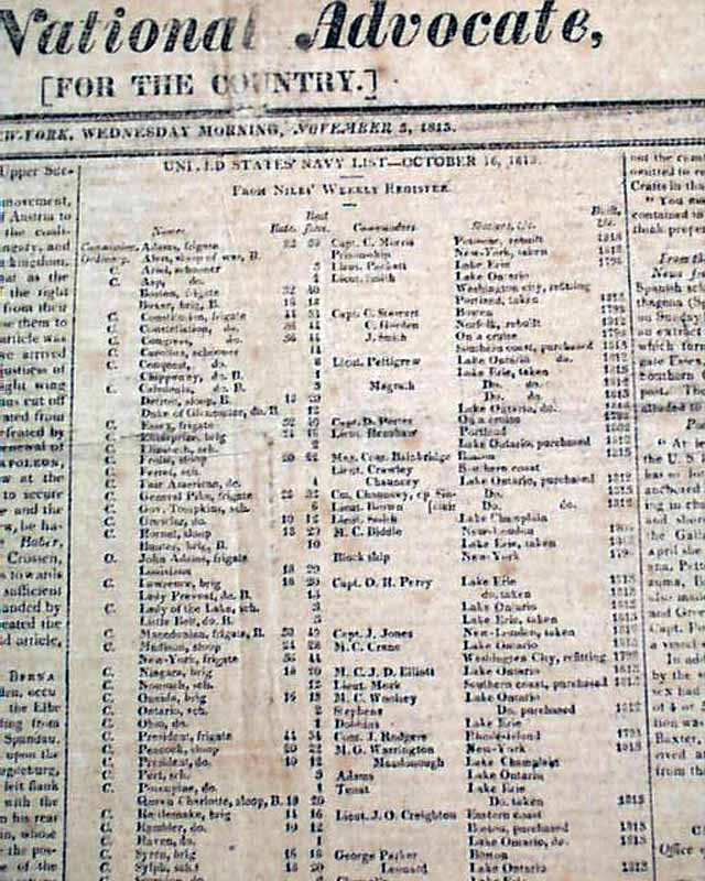 THE NATIONAL ADVOCATE, New York, Nov. 3, 1813  The front page has a rather large chart headed: "United States' Navy List" which includes the name of the vessel, the commodores, the stations, and the years built. Also a chart noting the: "Officers in the Navy of the United States" including: "Post Captains" and "Masters Commanders".