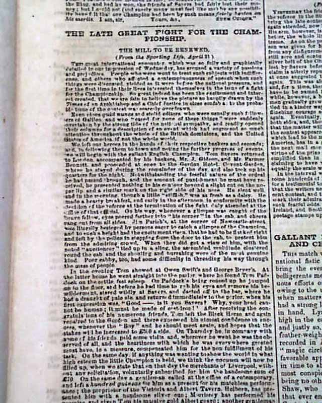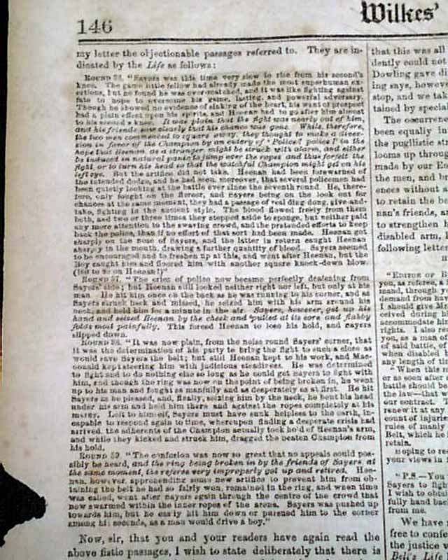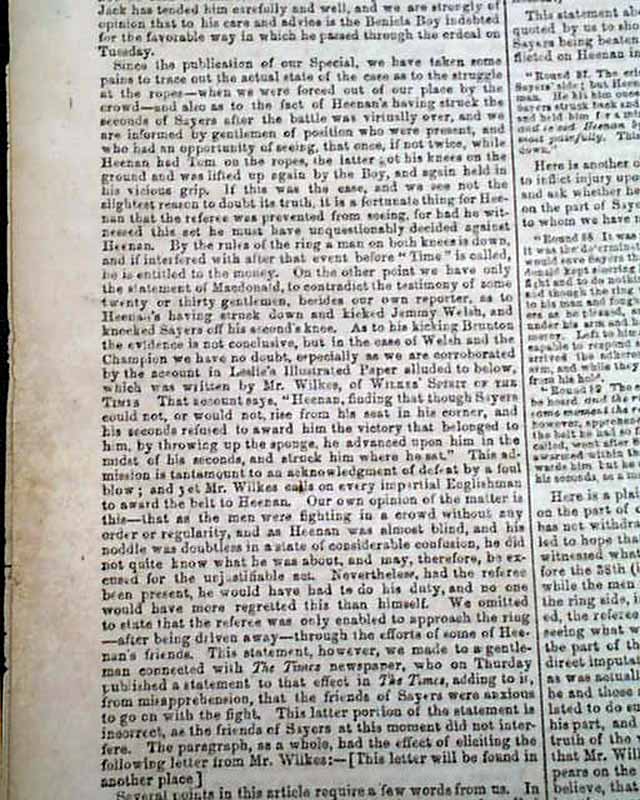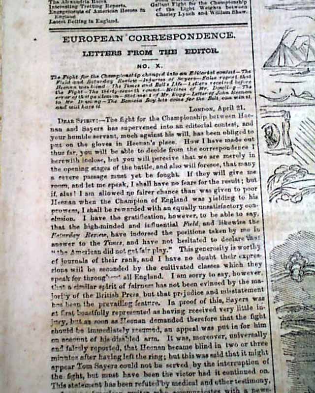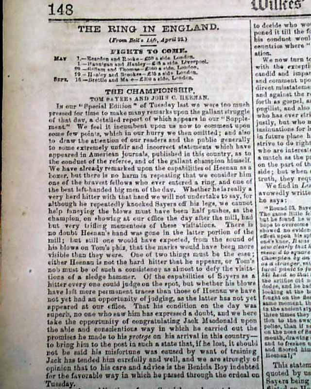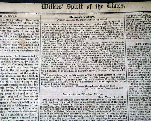 WILKES' SPIRIT OF THE TIMES, New York, May 12, 1860  This issue has great coverage of this historic boxing match for the championship between John Heenan and Tom Sayers, which lasted nearly 2 1/2 hours and ended in a draw.