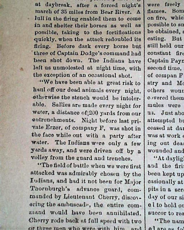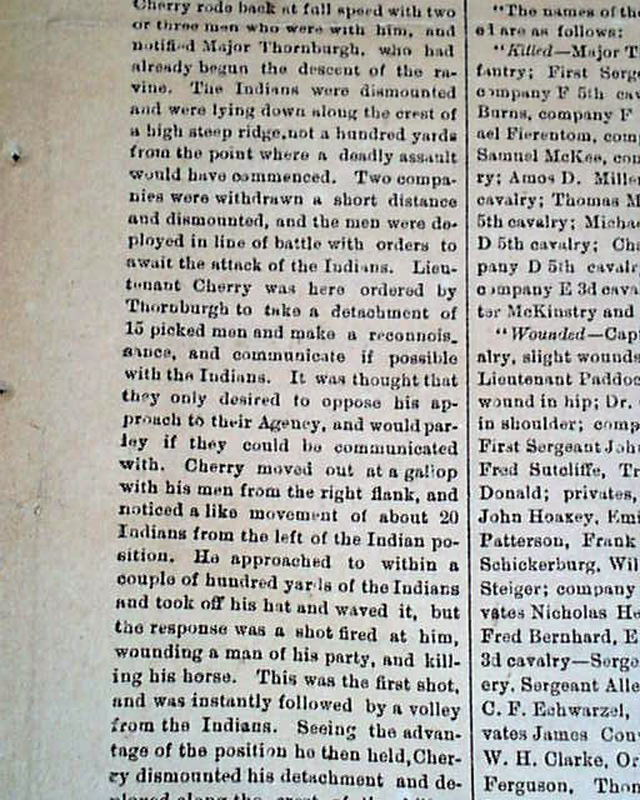 The front page has nearly the first two columns taken up with: "Thornburgh's Fight" "A Courier Brings News from the Besieged Troops--Thrilling Narrative of Thornburgh's Fight--The Troops Under Payne still Surrounded and in a Desperate Situation--A Gallant Body of Men".