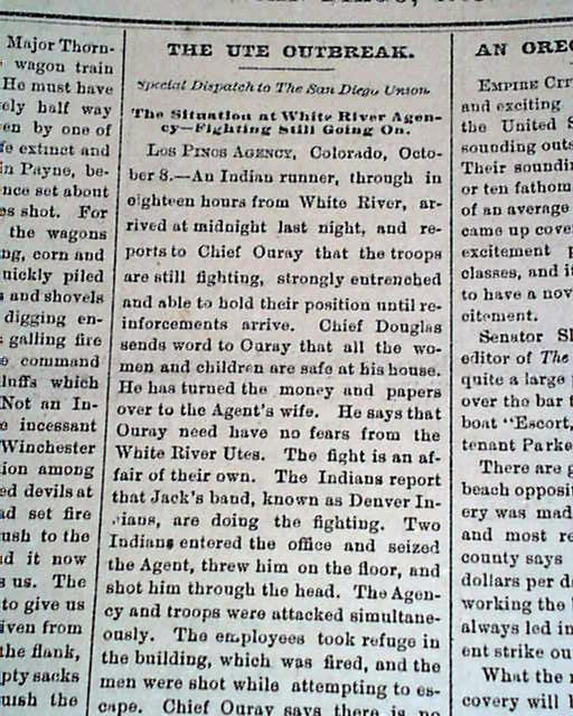 Also on the front page: "The Ute Outbreak" "The Situation at White River Agency--Fighting Still Going On" which has a dateline from Los Pinos Agency, Colorado, with mention of Chief Ouray.
