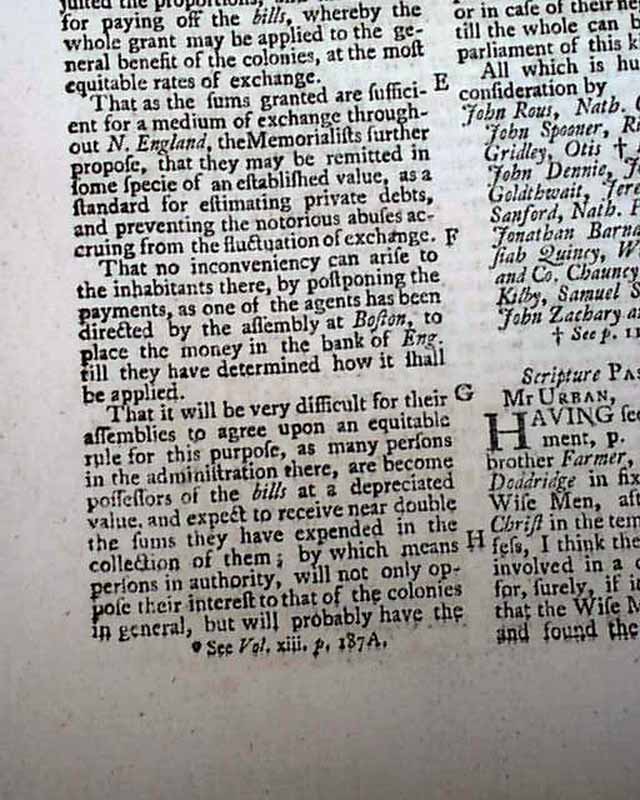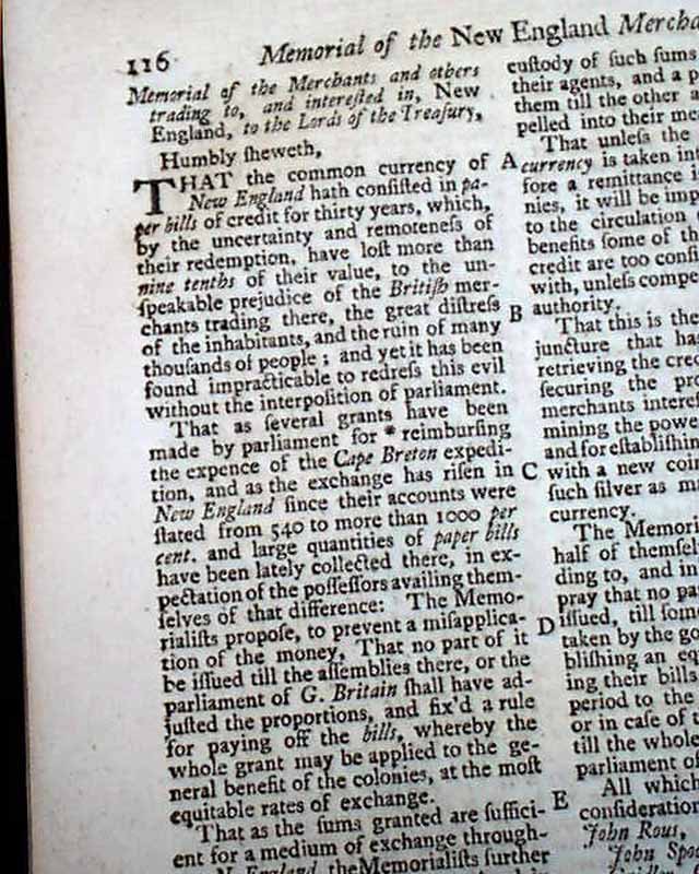 Also of interest is: "Memorial of the Merchants & Others Trading to, & Interested in, New England, to the Lords of the Treasury" which begins: "That the common currency of New England hath consisted in paper bills of credit for thirty years, which, by the uncertainty & remoteness of their redemption, have lost more than nine tenths of their value to the unspeakable prejudice of the British merchants trading there, the great distress of the inhabitants, and the ruin of many thousands of people..." with more.