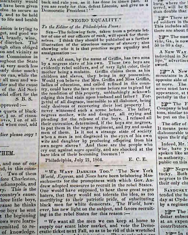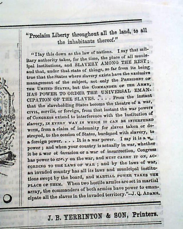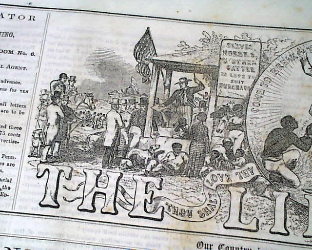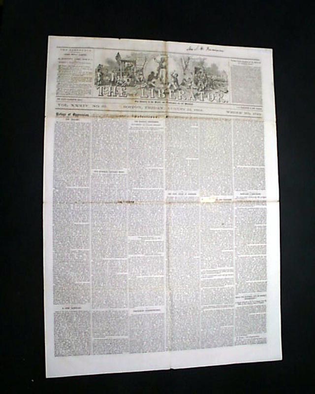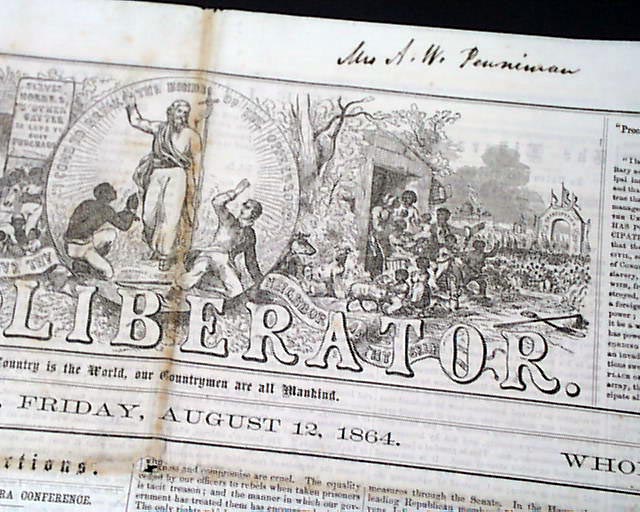 THE LIBERATOR, Boston, Aug. 12, 1864  This is the famous anti-slavery newspaper by famed abolitionist publisher William Lloyd Garrison. The masthead features two engravings, one of a slave auction and the other showing slaves being emancipated.