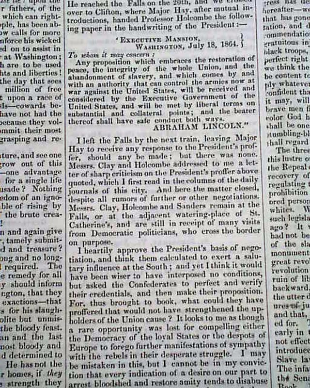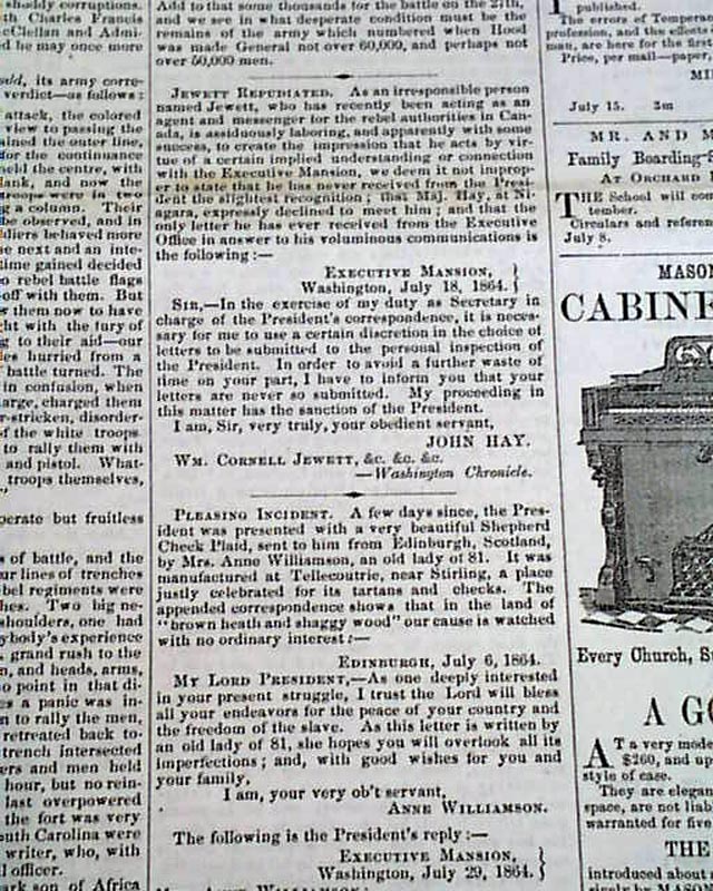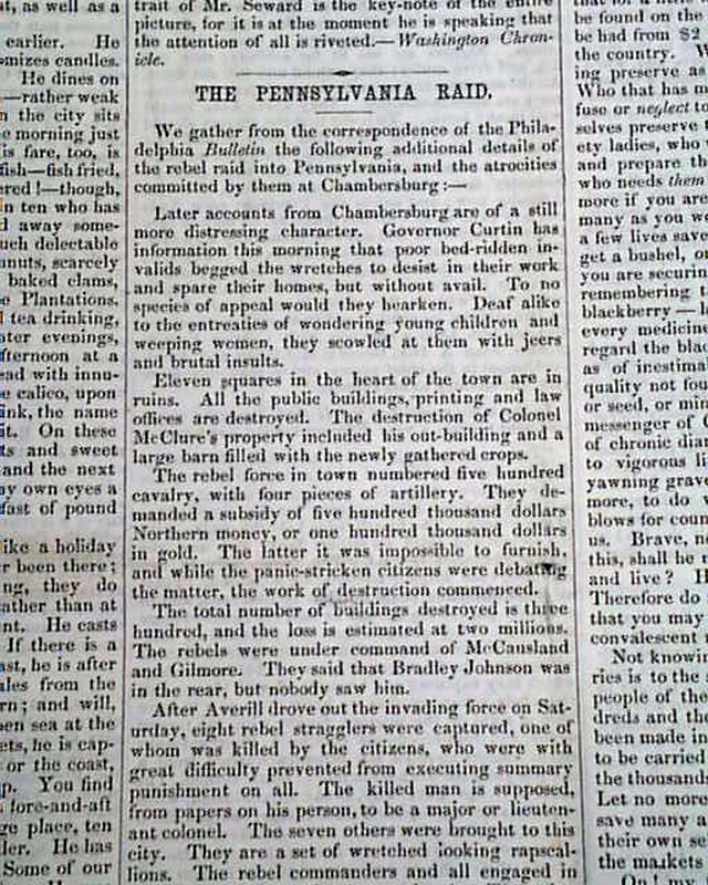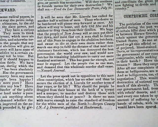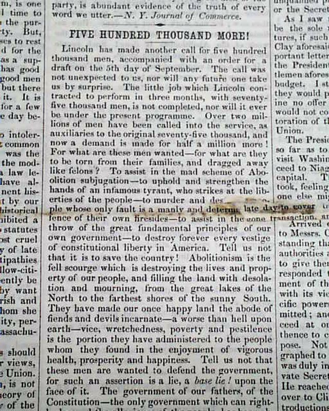 Articles include: "Five Hundred Thousand More!"; a note signed in type: Abraham Lincoln; "Shall Our National Life Be Ignobly Surrendered?" "The Pennsylvania Raids" "Negro Equality" and other war-related reports.