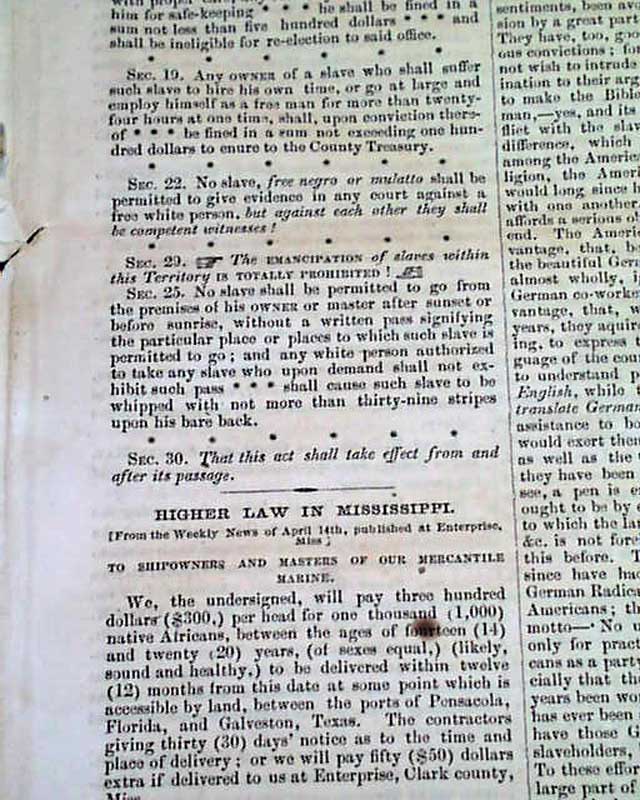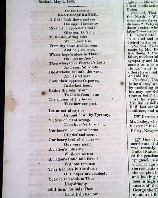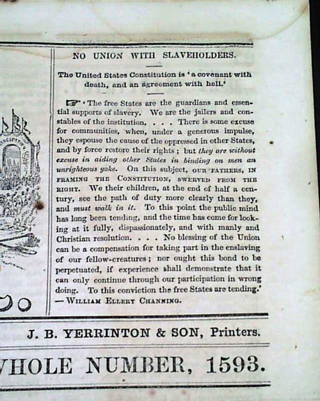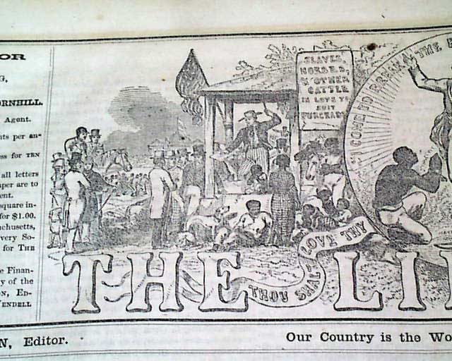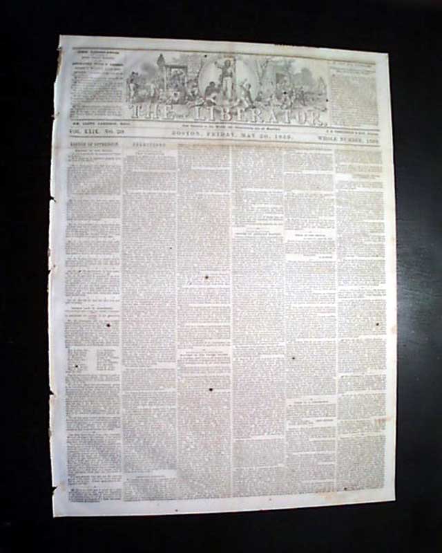 THE LIBERATOR, Boston, May 20, 1859 This is the famous anti-slavery newspaper by famed abolitionist publisher William Lloyd Garrison with a masthead engraving showing slaves being sold, then emancipated.