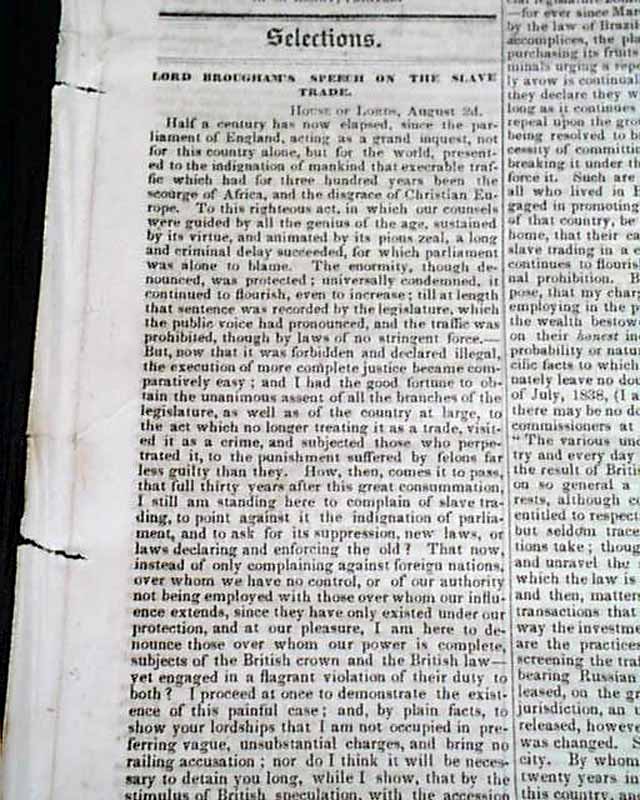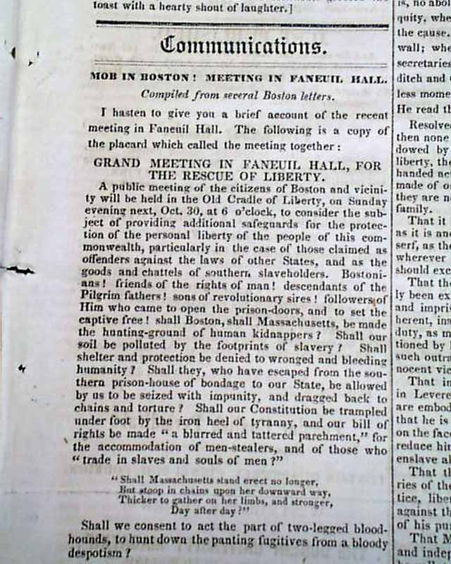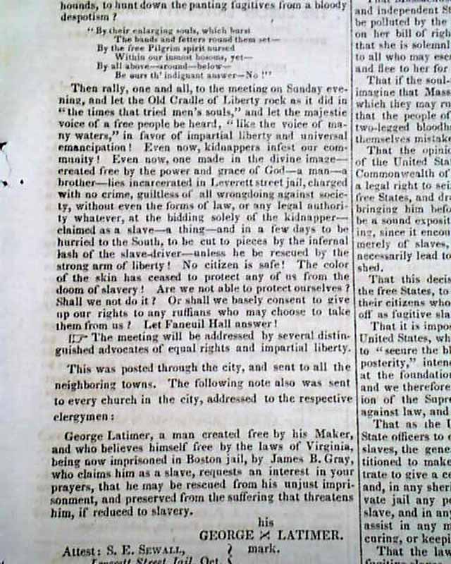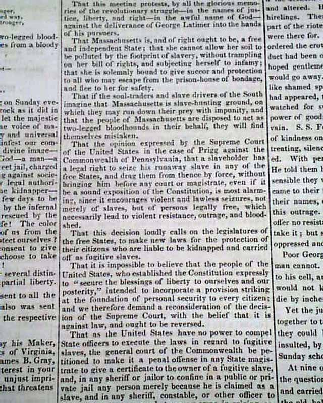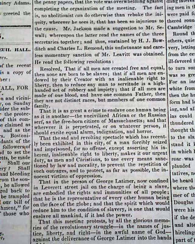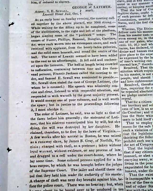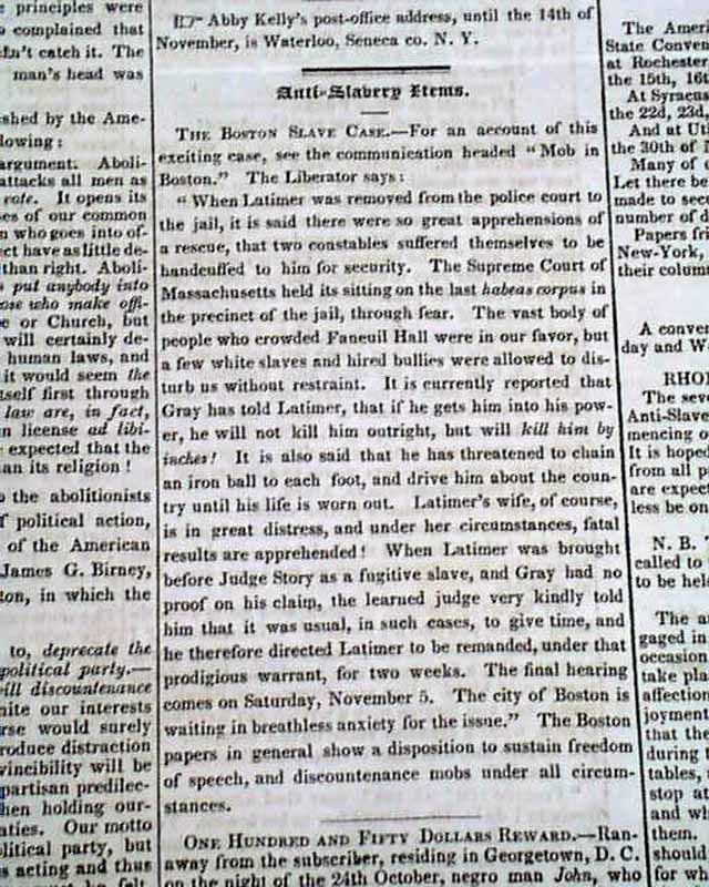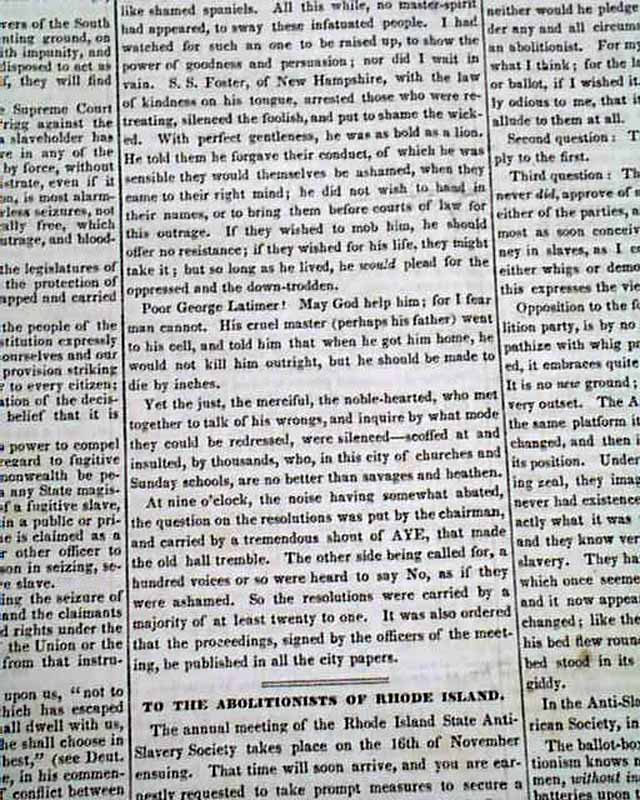 Although there are various articles relating to the anti-slavery movement, the most notable content is that concerning the case of escaped slave George Latimer, which became a major political issue in Massachusetts at the time. Over one-third of page 3 is taken up with related reports, headed: "Mob In Boston! Meeting In Faneuil Hall". Then there is more under the heading: "Anti-Slavery Items--The Boston Slave Case". Photos show only portions.