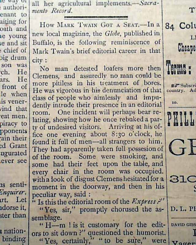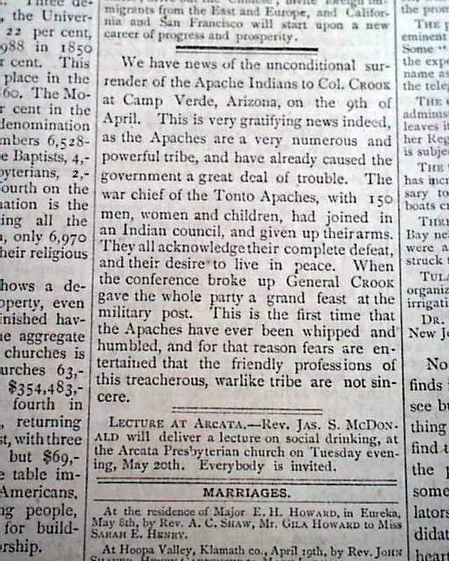 Page 2 has a report beginning: "We have news of the unconditional surrender of the Apache Indians to Col. Crook at Camp Verde, Arizona...very gratifying news indeed..." with further details. The front page has; "How Mark Twain Got a Seat".