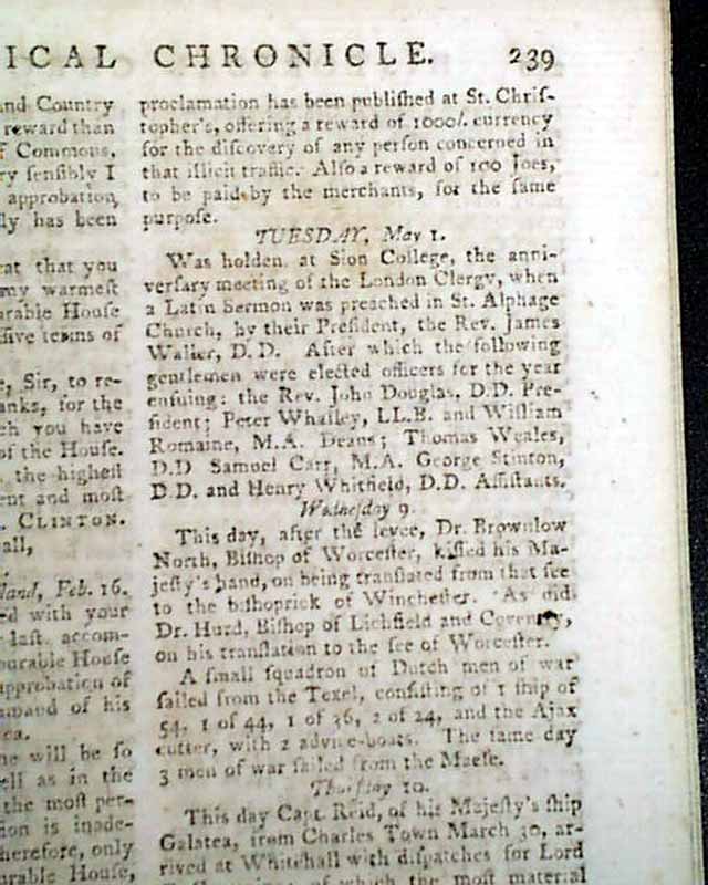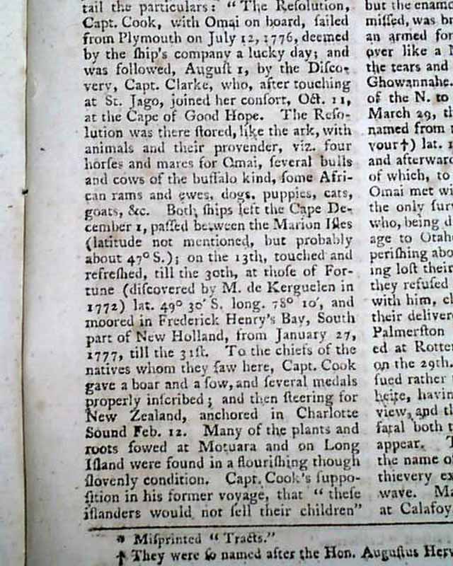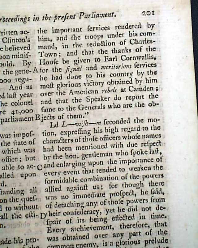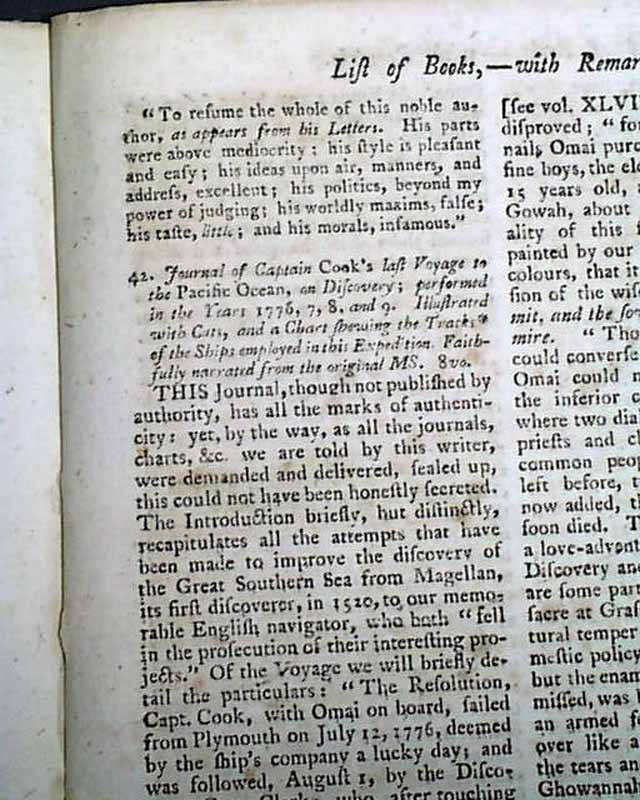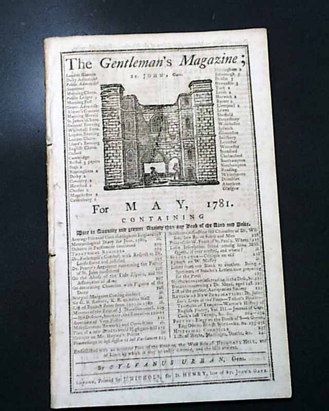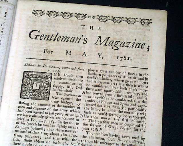 Item # 678673 GENTLEMAN'S MAGAZINE London, May, 1781 Content includes: "Debates in Parliament" includes talk on America. Another report is a review of the: "Journal of Captain Cook's Last Voyage to the Pacific Ocean, on Discovery, performed in the Years 1776, 7, 8 & 9..." which takes over 3 pages.