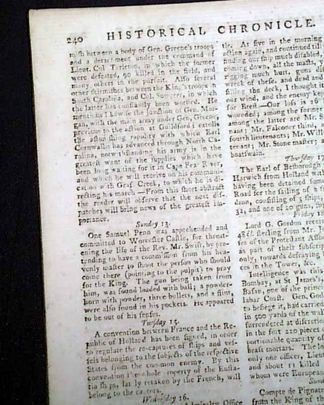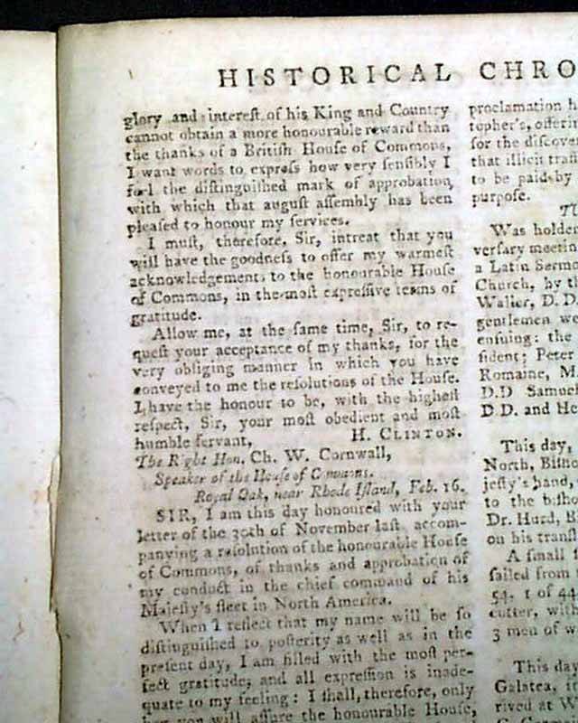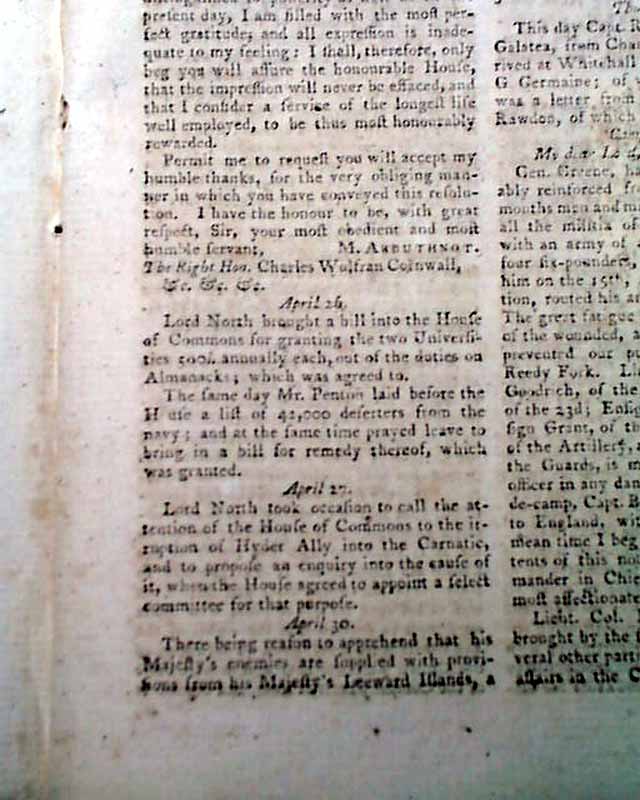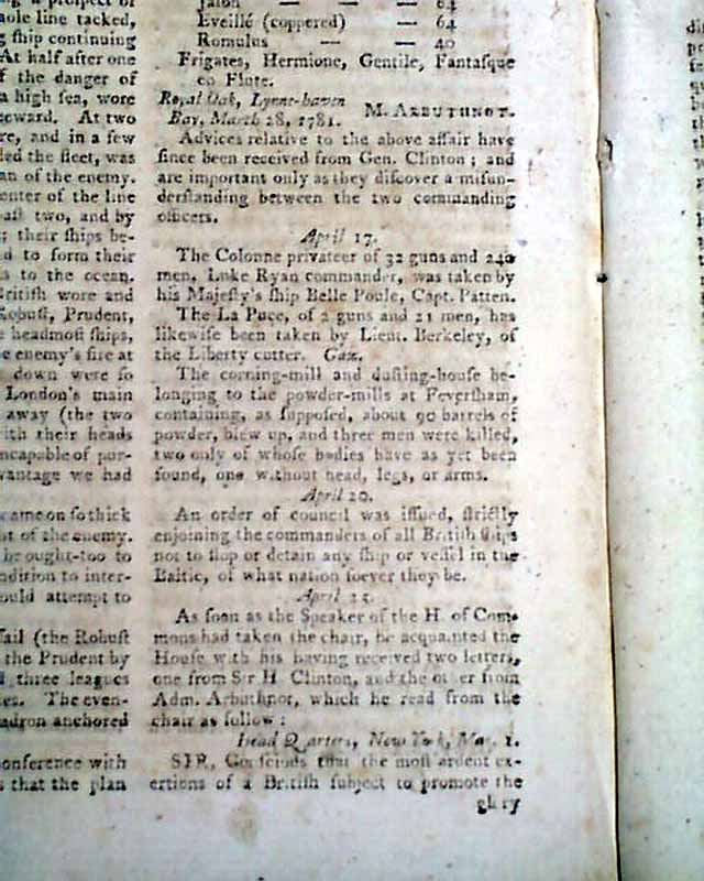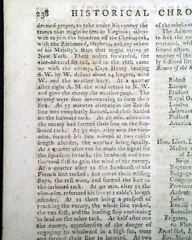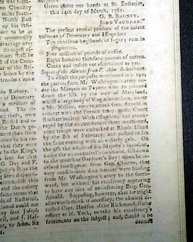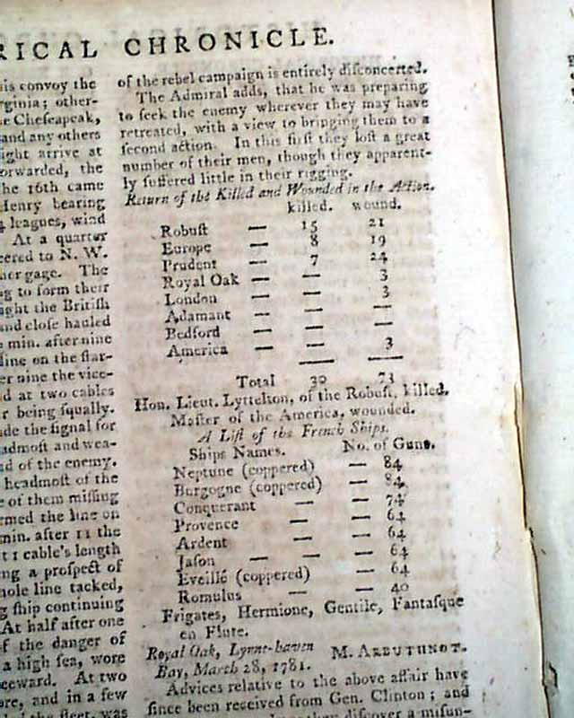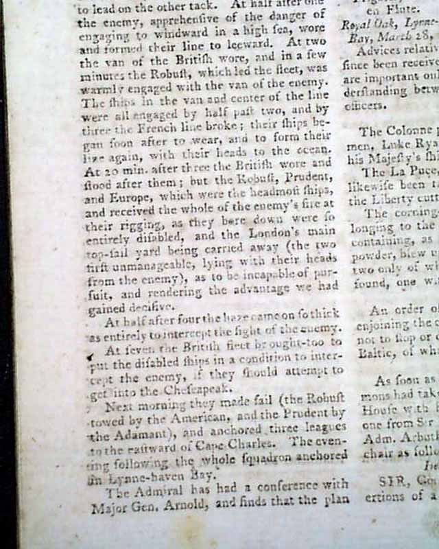 Another report mentions in part: "...parties from Mr. Washington's army under the Marquis de Fayette were to proceed down the Elk by the way of Maryland, whilst a large body of Virginians militia under Mr. Nelson were to attack Gen. Arnold...the Admiral has had a conference with Gen. Arnold and finds that the plan of the rebel campaign is entirely disconcerted..." with much content on the naval battle followed by a list of killed & wounded & the ships involved.