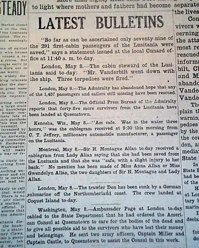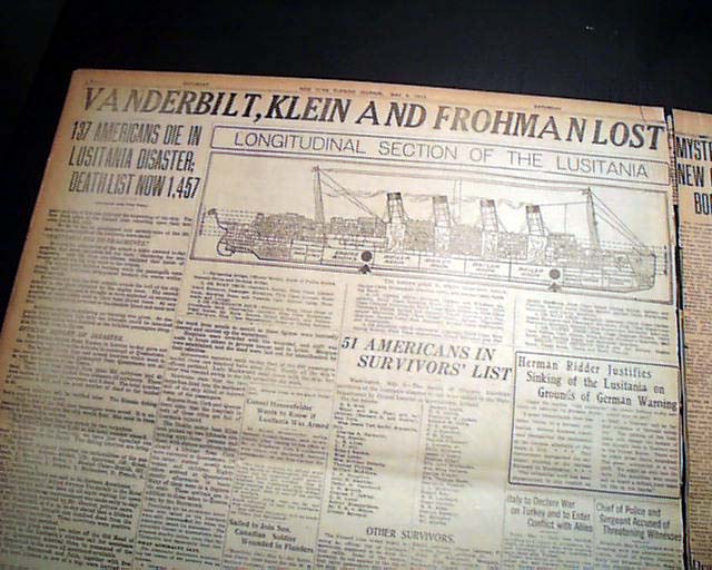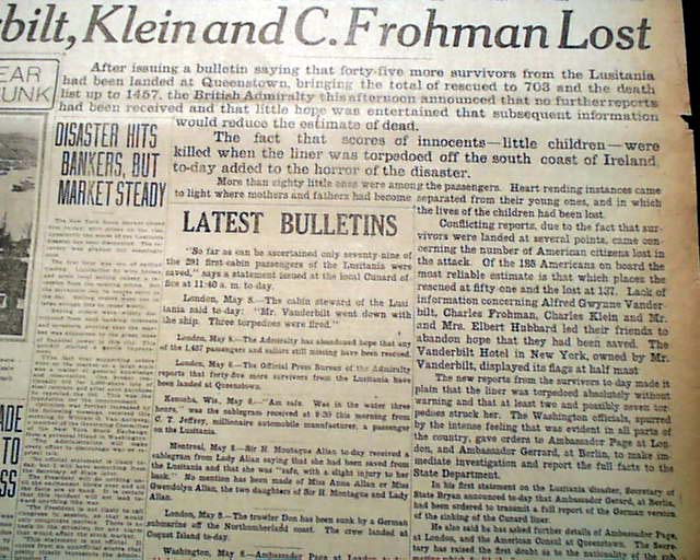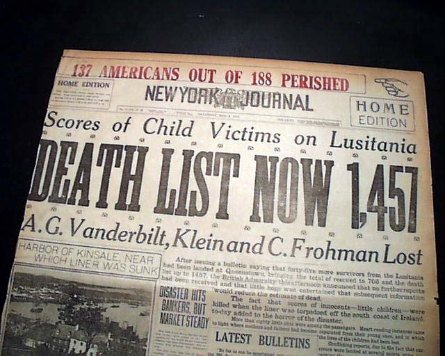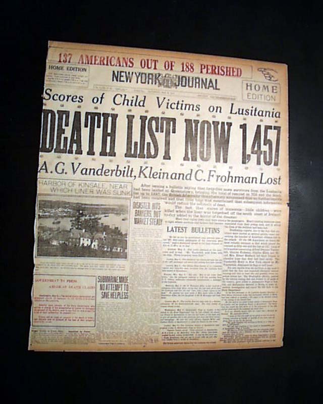NEW YORK JOURNAL, May 8, 1915  The bold banner headline announces: "DEATH LIST NOW 1,457" above which is: "Scores of Child Victims on Lusitania" and beneath: "A. G. Vanderbilt, Klein and C. Frohman Lost". Also a photo of the harbor of Kindle, near where the Lusitania was sunk.