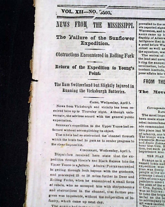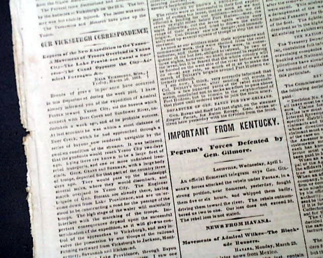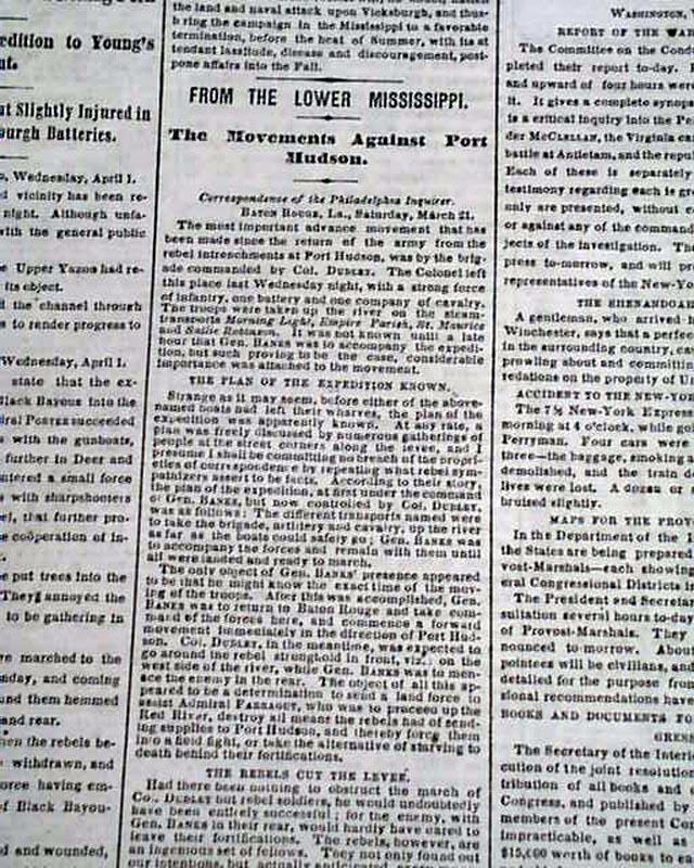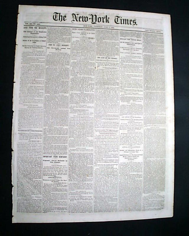 NEW YORK TIMES, April 2, 1863 Among the front page column heads on the Civil War are: "News From the Mississippi" "Latest Rebel News" "Important From Kentucky" "Pegram's Forces Defeated by Gen. Gilmore" "The Movements Against Port Hudson" "Report of the Committee on the Conduct of the War" & much more.