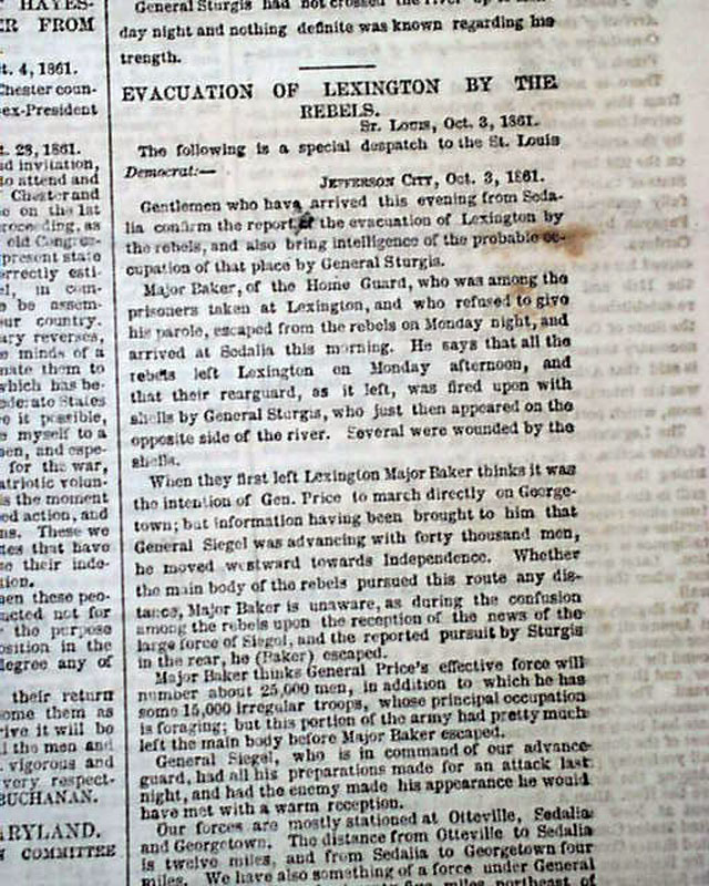 Among the ftpg. column heads on the Civil War are: "THE REBELLION" "Defeat of Lee's Rebel Forces at Greenbrier by Gen. Reynolds" "Decisive Battle Near Lexington" "Evacuation of Lexington by the Rebels" "Gen. Sherman Appointed to the Department of Kentucky" "Lexington Evacuated by the Rebels" and more.