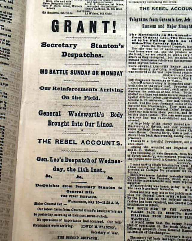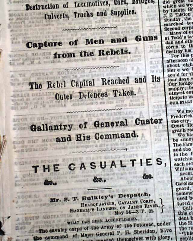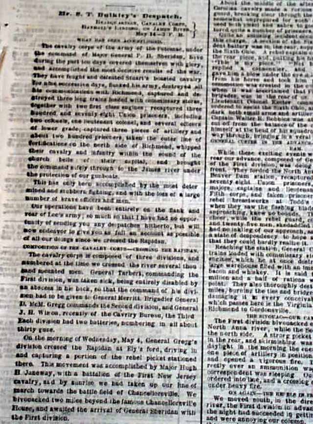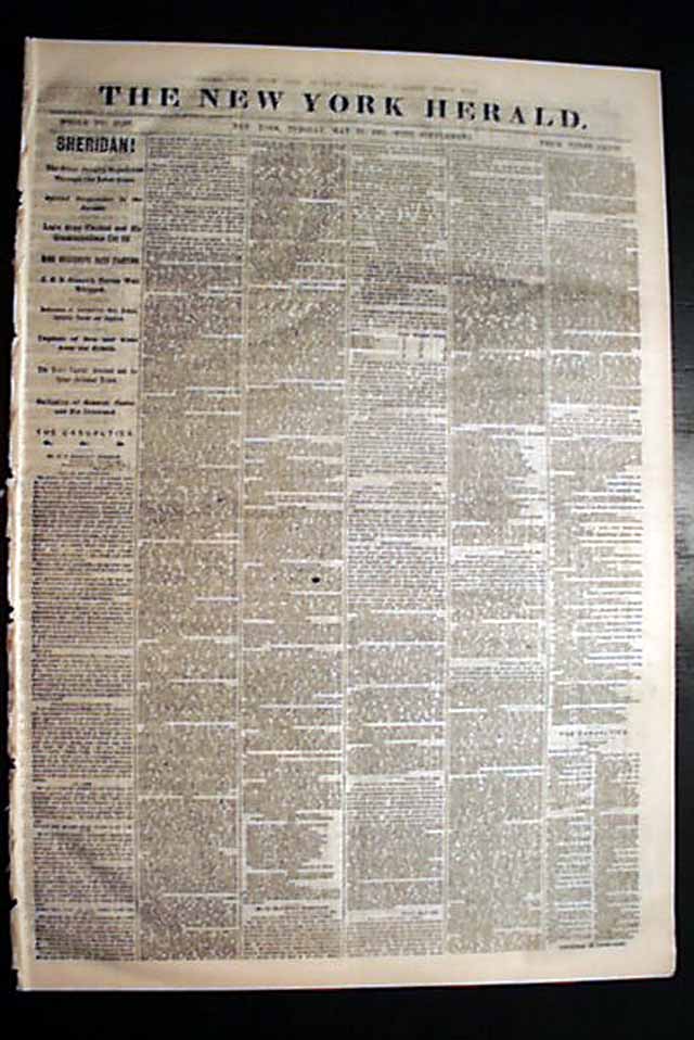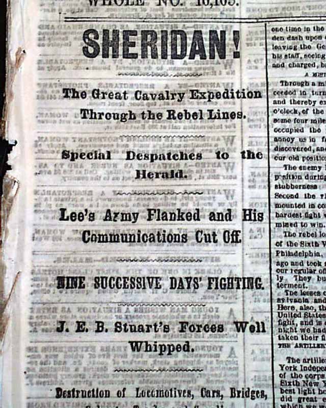 NEW YORK HERALD, May 17, 1864  The first column has a nice stack of headlines including: "SHERIDAN ! " The Great Cavalry Expedition Through the Rebel Lines" "Lee's  Army Flanked & His Communications Cut Off" "J.E. B. Stuart's Forces Well Whipped" "Capture of Men & Guns from  the Rebels" "Gallantry of General Custer & His Command" and more.