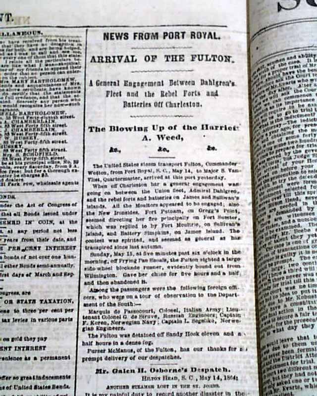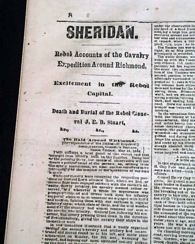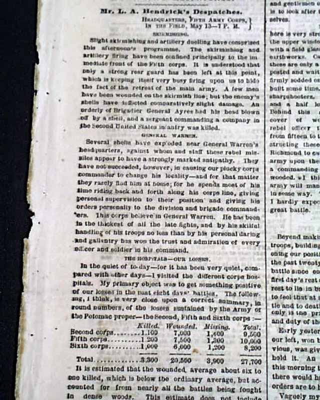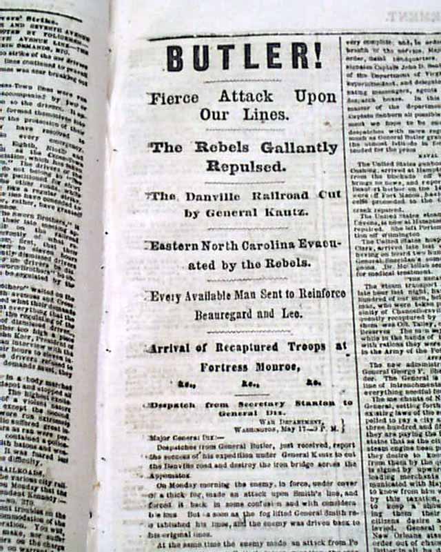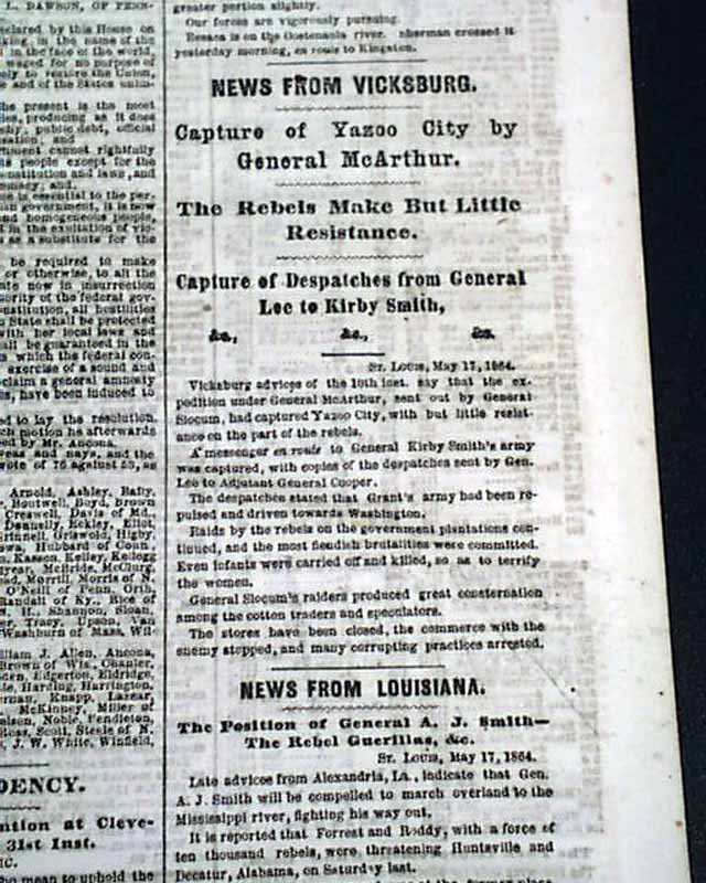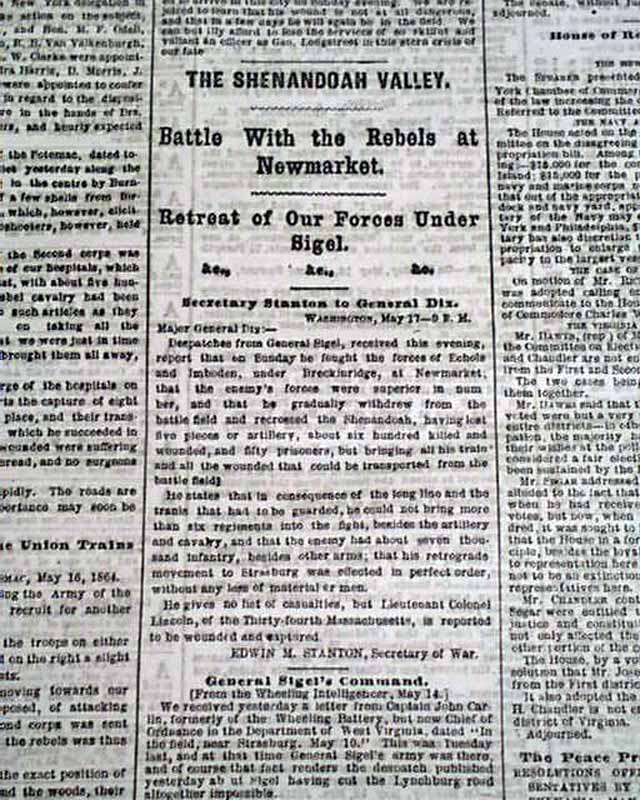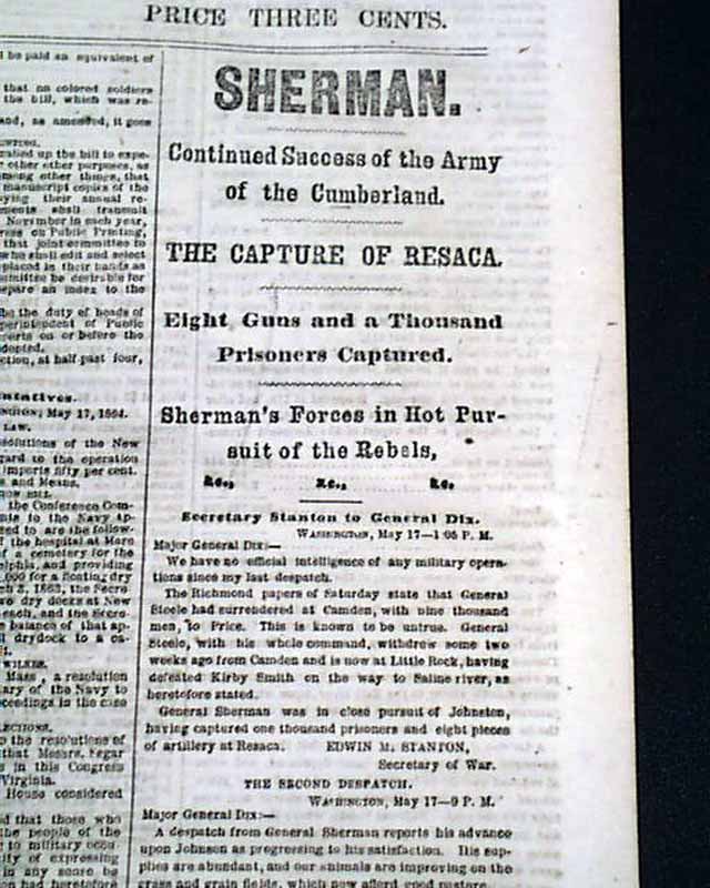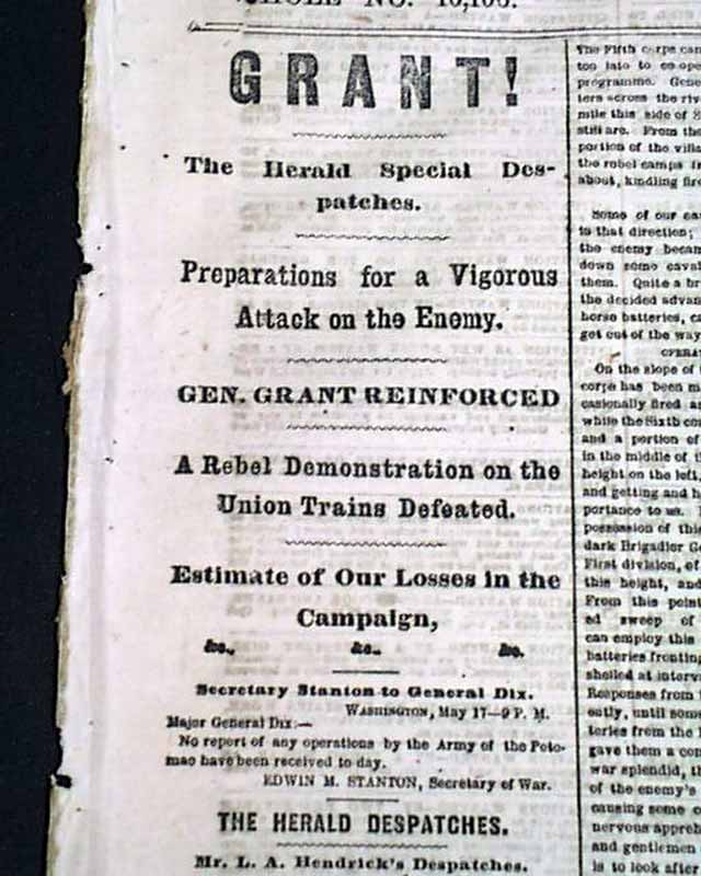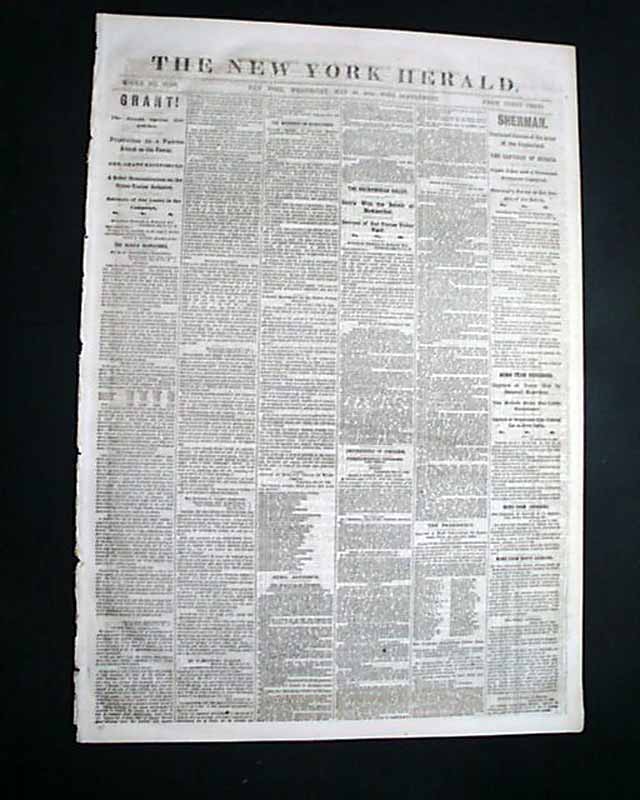 NEW YORK HERALD, May 18, 1864 Among the front page column Civil War heads are: "GRANT ! " "Preparations for a Vigorous Attack on the Enemy" "Gen. Grant Reinforced" "A Rebel Demonstration on the Union Trains Defeated", "The Shenandoah Valley" "Battle With the Rebels at Newmarket" "SHERMAN" "The Capture of Resaca" "Sherman's Forces in Hot Pursuit of the Rebels" "Capture of Yazoo City by General McArthur" and much more. More inside as well. Also included is the single sheet "Supplement".