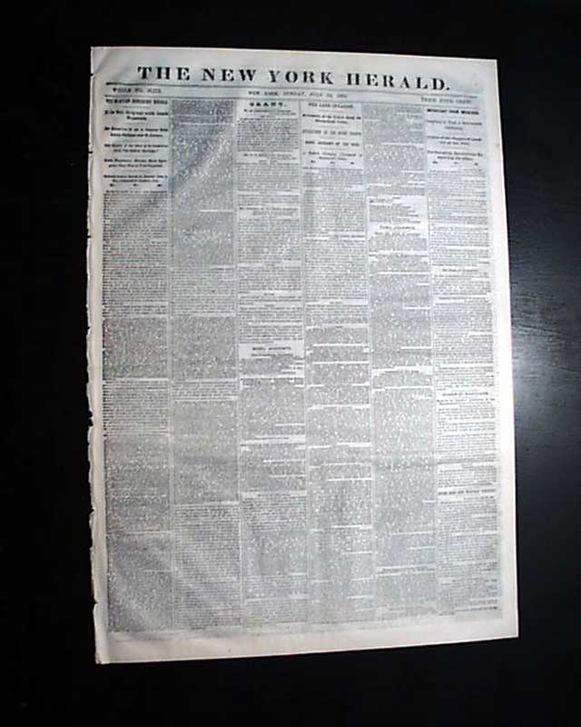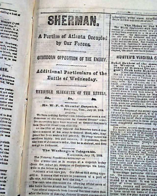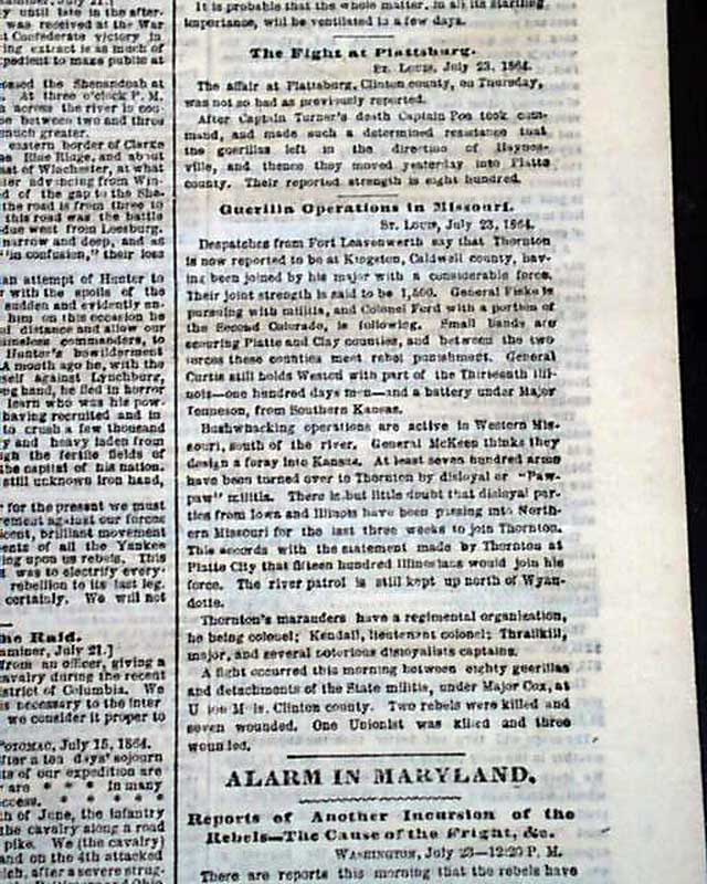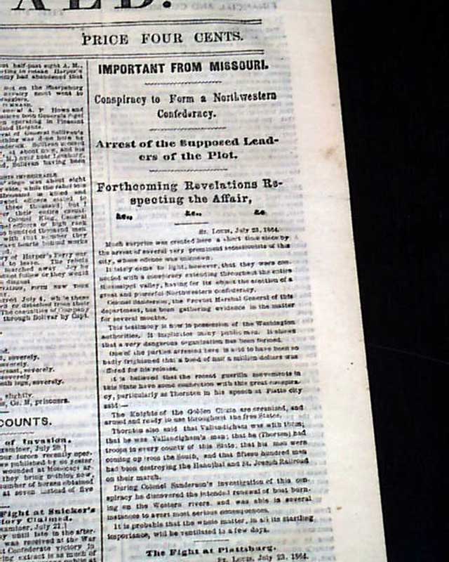 Among the front page column heads on the Civil War are: "Grant" "The Late Invasion" "Movements of the Rebels Along the Shenandoah Valley" "Rebel Account of the Raid" "Rebel Victory Claimed at Snicker's Gap" "Important from Missouri" "Conspiracy to Form a Northwestern Confederacy" "Arrest of the Supposed Leaders of the Plot" and more.