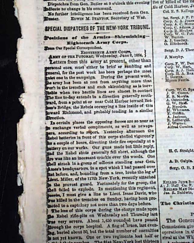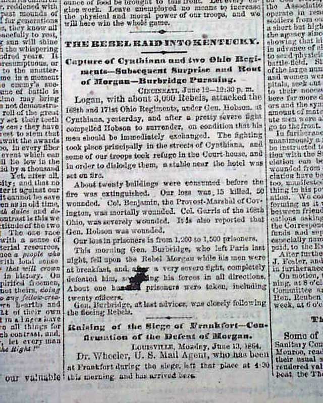 Among the front page column heads on the Civil War are: "THE GREAT CONTEST" "An Important Movement in Grant's Army" "It is So Far Successful" "Grant Sliding Down by the Left" "He Whips Morgan's Forces" "A Look at Rebel Journals" "The Rebel Raid Into Kentucky" and much more.