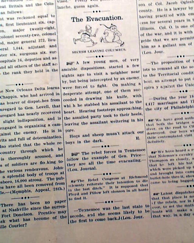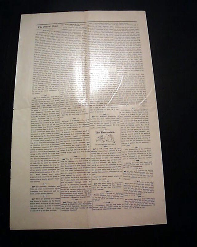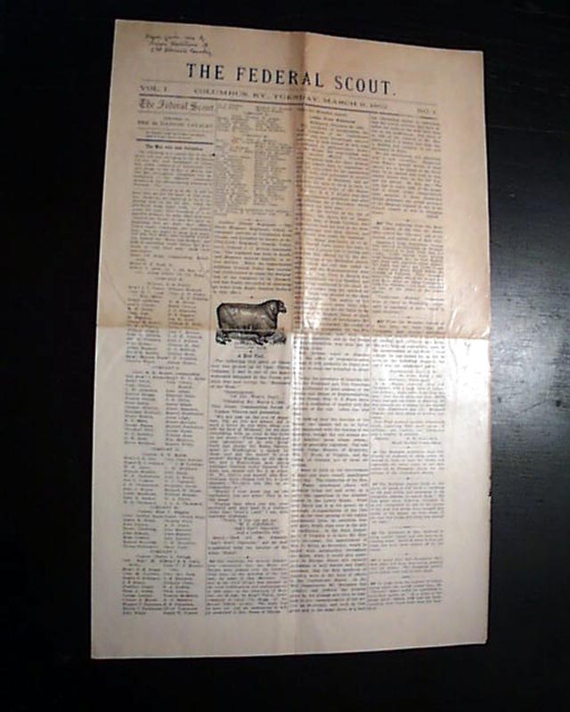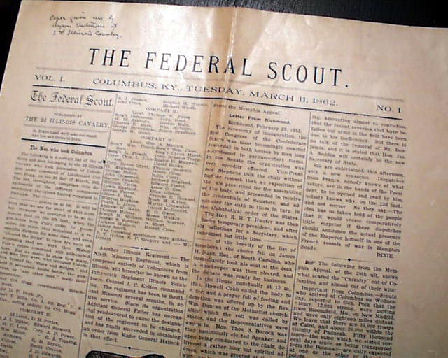 THE FEDERAL SCOUT, Columbus, Kentucky, March 11, 1862 Note that this is a rather rare reprint of the original issue which was printed by the 2nd Illinois Cavalry after the occupation of Columbus, Kentucky. The only origin know is at the Hickman County Museum in Clinton, Kentucky, in poor condition. This volume 1 #1 issue was the only issue printed.