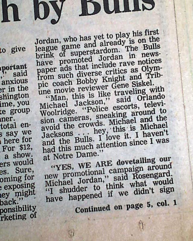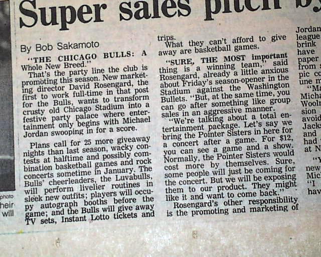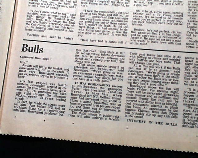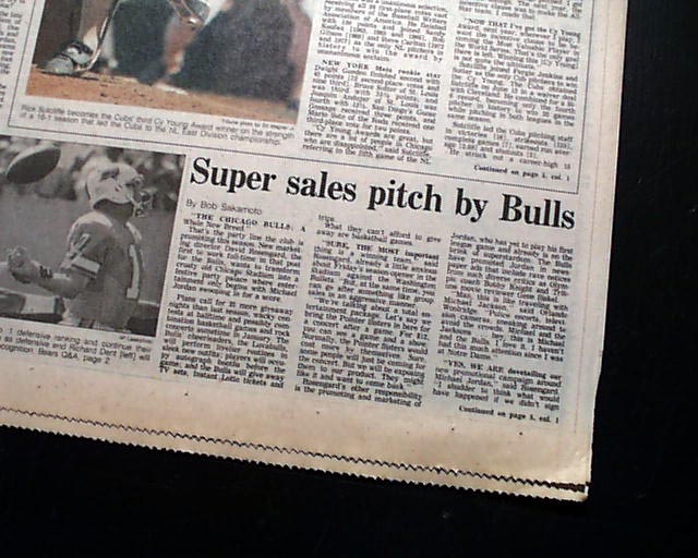 The bottom of the front page of the sport's section has a three column heading: "Super sales pitch by Bulls" which has coverage on the impending opening day game just 2 days later. The bottom of page 6 of this section has a neat advertisement headed: "Michael Jordan's 1st NBA Game" (see) I expect this to be an extremely rare item because their was really no reason to save it at the time.