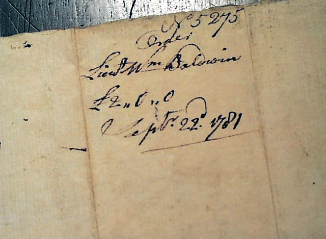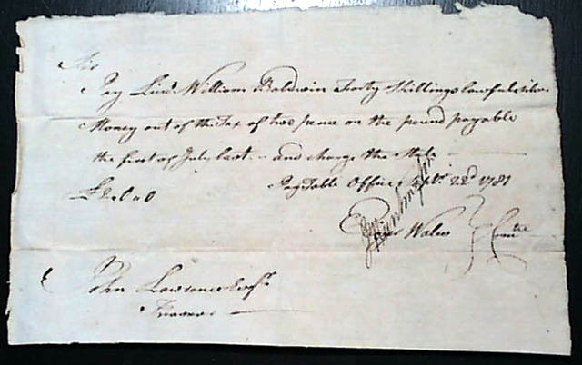 A hand-written Revolutionary War pay document from the State of Connecticut dated Sept. 22, 1781. It notes: "Sir: Pay Lieut. William Baldwin forty shillings lawful silver money...and charge the state...Pay Table Office, Sept. 22, 1781" with two signatures.