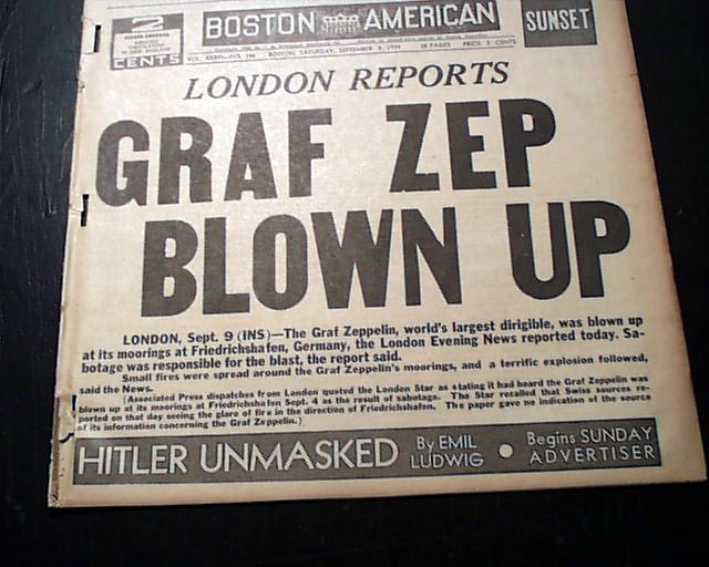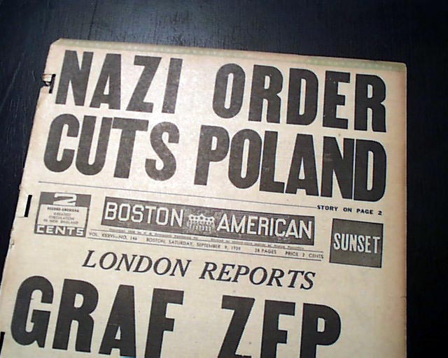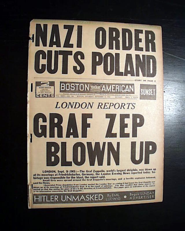 A tabloid-size newspaper with the front page taken up with: "NAZI ORDER CUTS POLAND" and then: "London Reports GRAF ZEP BLOWN UP", the latter being untrue.