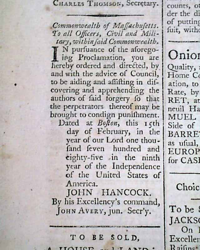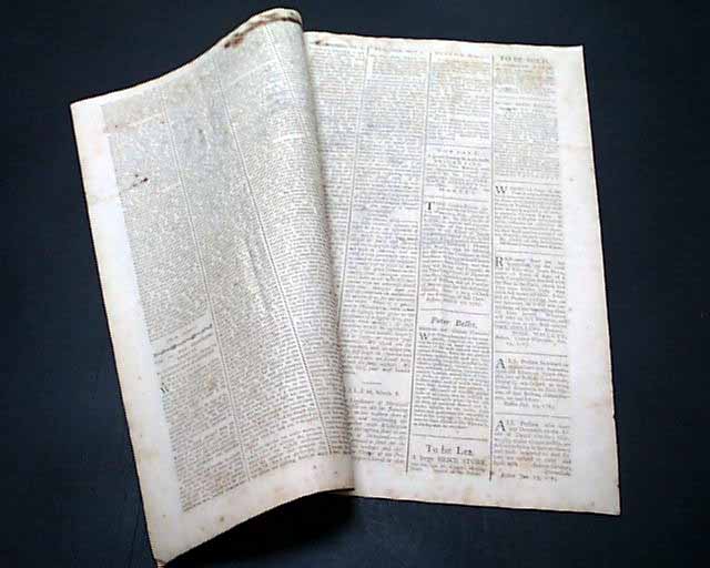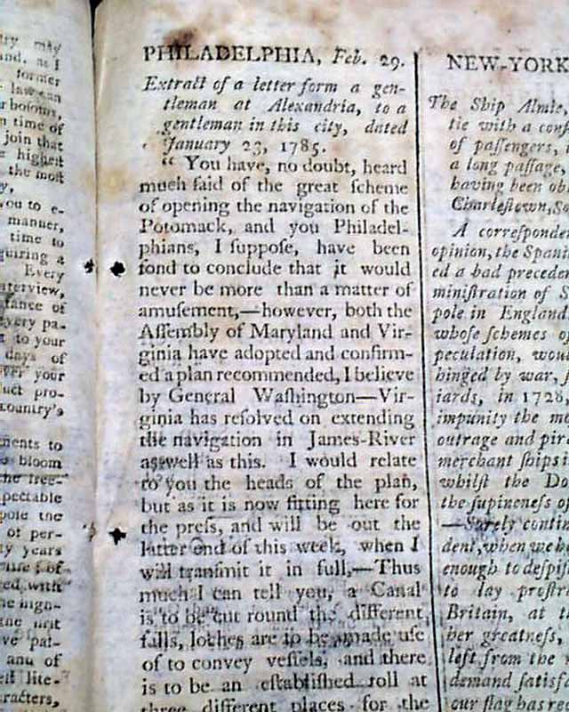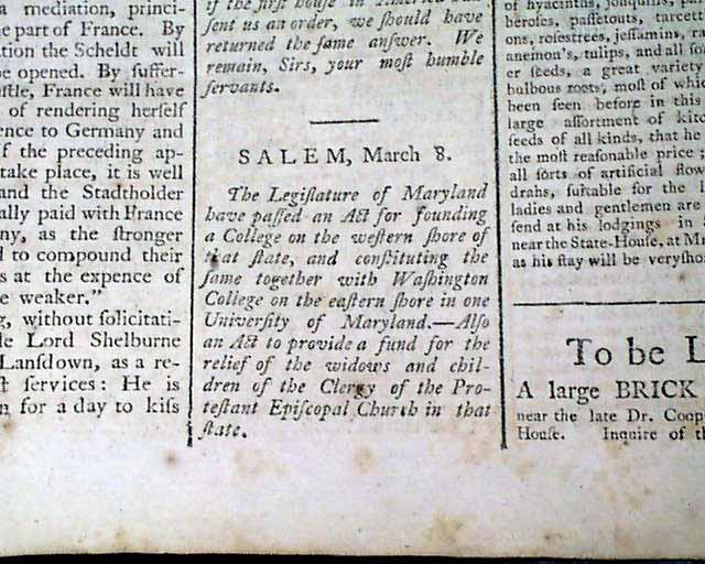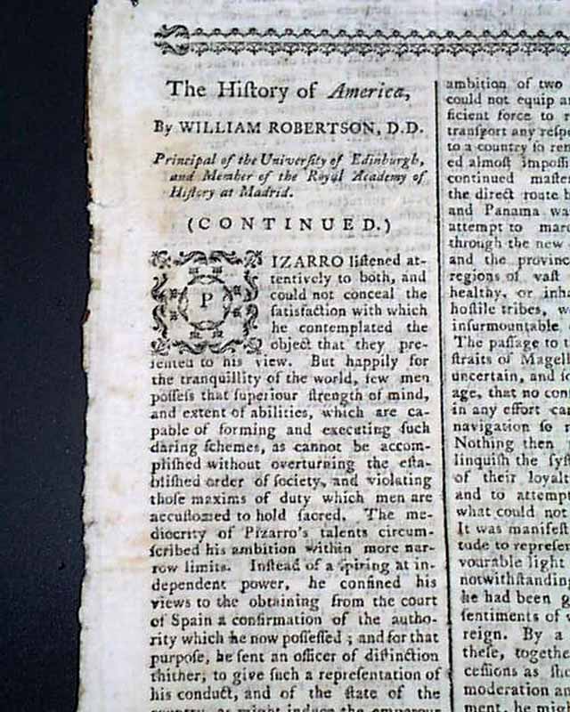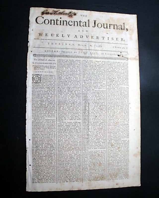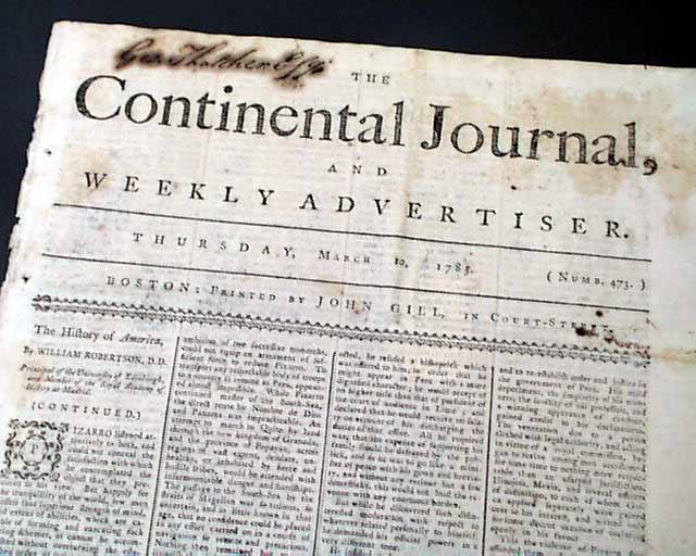 THE CONTINENTAL JOURNAL & WEEKLY ADVERTISER, Boston, March 10, 1785 The entire front page is taken up with the continued: "History of America, by William Robertson".