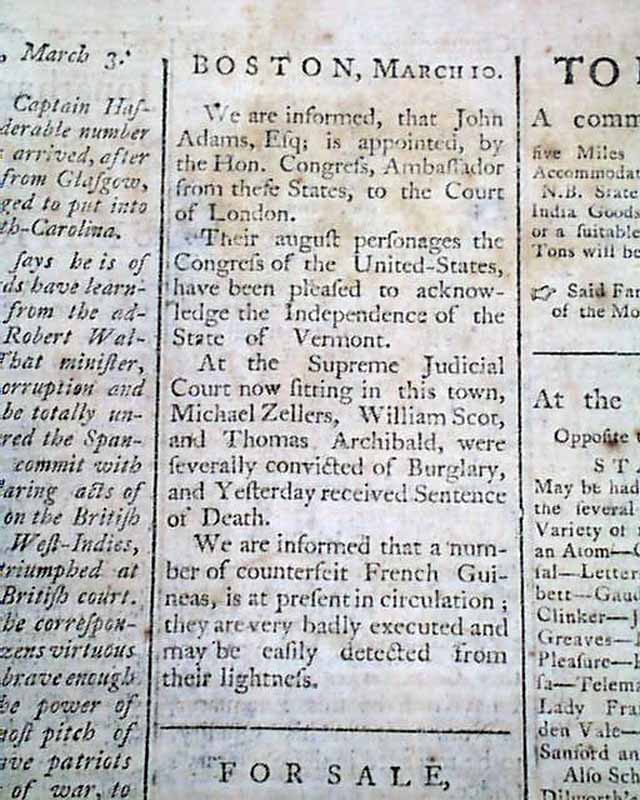 Richard Henry Lee & John Hancock on counterfeiters... John Adams is ambassador to England... Vermont gains its independence...