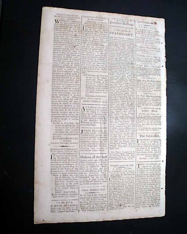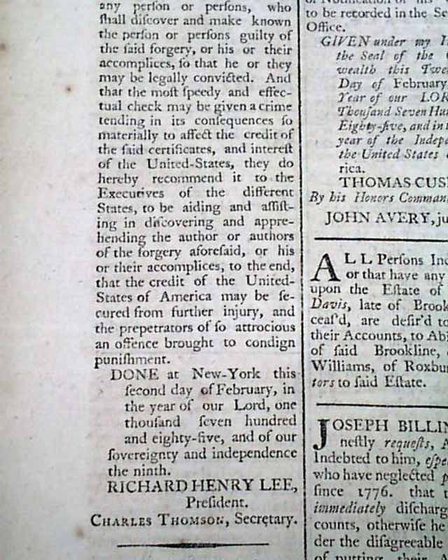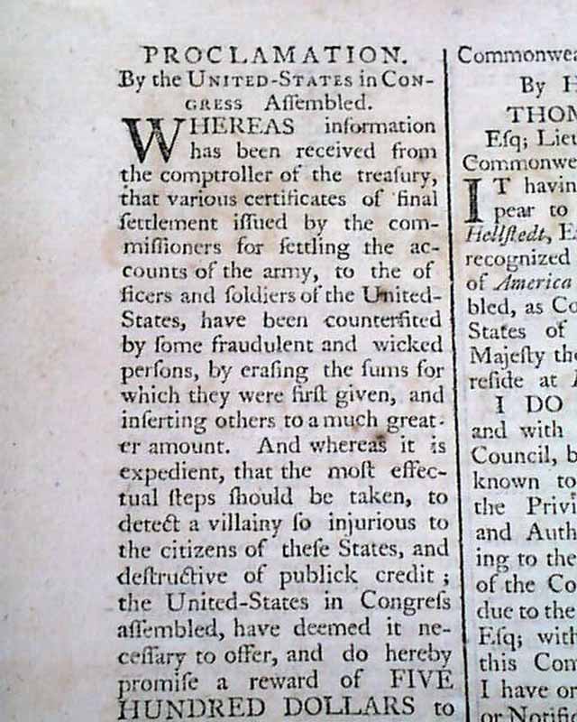 Page 4 has a "Proclamation by the United States..." offering a $500 award to counterfeiters, signed in type: Richard Henry Lee, who was President of Congress when it had recently relocated from Trenton to New York. This is followed by a document from Massachusetts supporting the Proclamation, signed in type: John Hancock.
