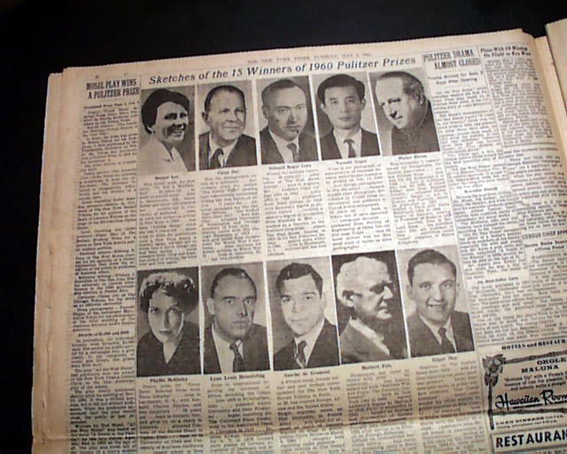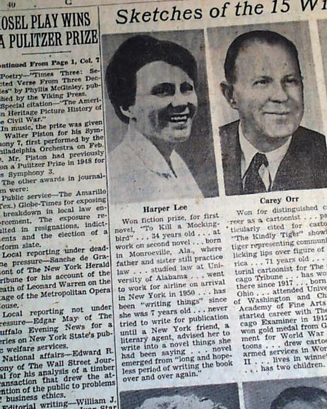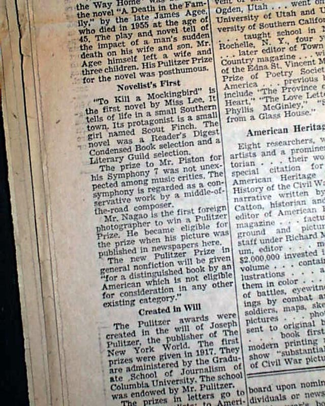 Near the bottom of the front page is a two column heading: "Pulitzer for 'All the Way Home'; 'To Kill a Mockingbird' Is Novel" Reporting continues on page 40 with photos of the winners including Harper Lee. (see)
