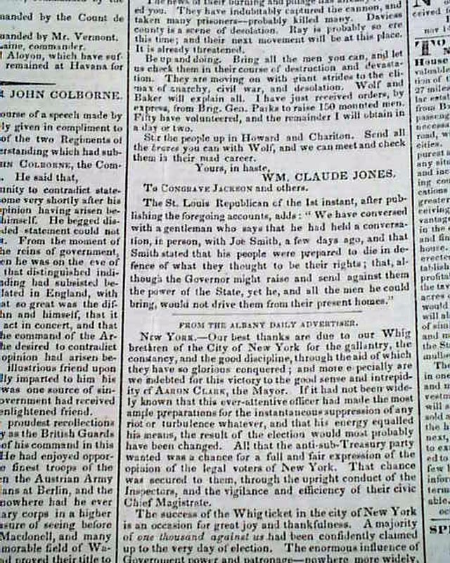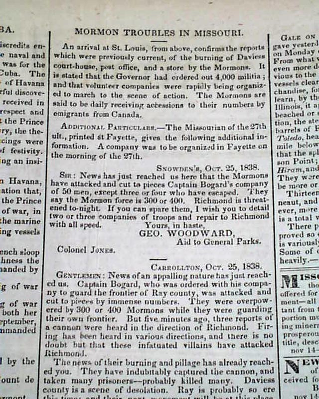 A few bits include: "...the burning of Daviess court house, post office, and a store by the Mormons...the governor has ordered out 4,000 militia...The Mormons are said to be daily receiving accessions to their numbers by emigrants from Canada..." and then: "...that the Mormons have attacked and cut to pieces Captain Bogard's company of 50 men...They say the Mormon force is 300 or 400..." and even more, as shown in the photos.