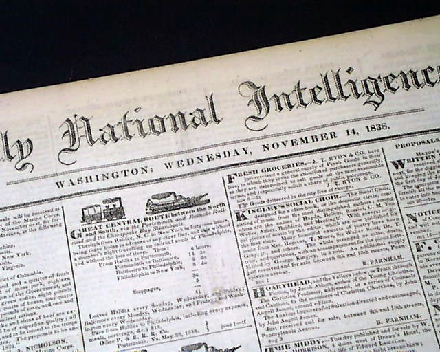 DAILY NATIONAL INTELLIGENCER, Washington, D.C., Nov. 14, 1838 Page 3 has one-third of a column taken up with Mormon-related reports, the primary article headed: "Mormon Troubles In Missouri".