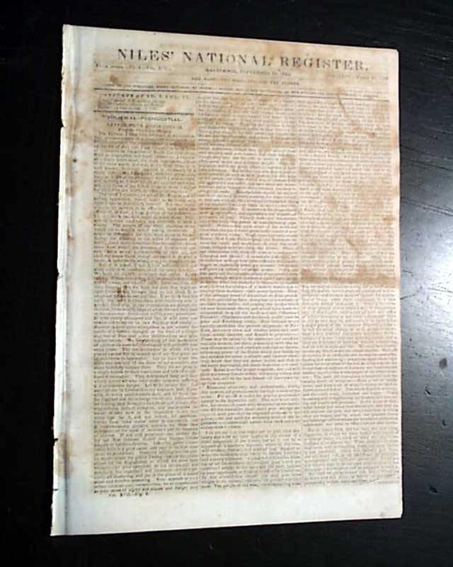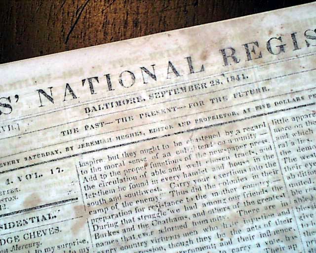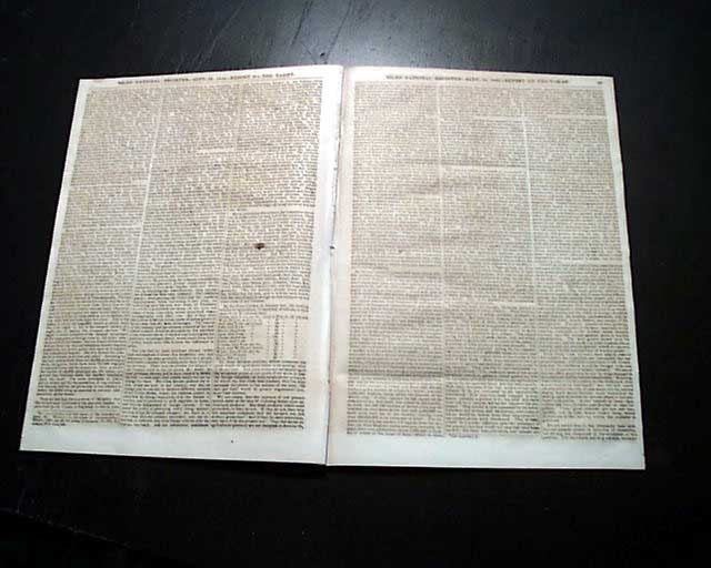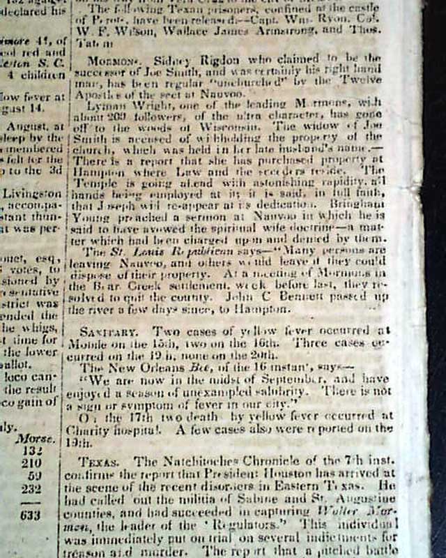NILES' NATIONAL REGISTER, Baltimore, Sept. 28, 1844 The back page has a report with a small heading: "Mormons" which notes in part: "Sidney Rigdon, who claimed to be the successor of Joe Smith, and was certainly his right hand man, has been regular "unchurched" by the Twelve Apostles of the sect at Nauvoo. Lyman Wight, one of the leading Mormons with about 200 followers...has gone off to the woods of Wisconsin. The widow of Joe Smith is accused of withholding the property of the church..." and more.