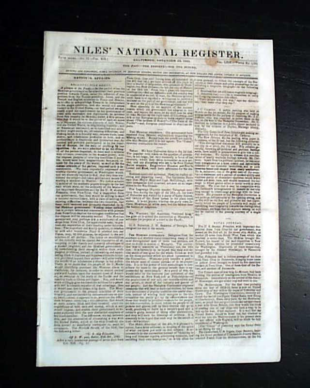 NILES' NATIONAL REGISTER, Baltimore, Nov. 15, 1845 The back page has an item noting: "Emma Smith, the widow of the deceased prophet, claims at least a wife's portion of her late husband's worldly gear, including, it is said, besides the Temple itself at Nauvoo, large and valuable tracts of land in Illinois, for Joseph was suspected of having a hawk's eye towards the mammon of unrighteousness. Emma dislikes the notion of leaving those substantial possessions for any prospects which she can perceive in the future, and wishes to remain to take care of number one."