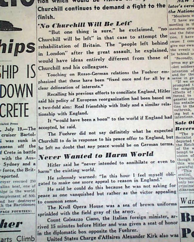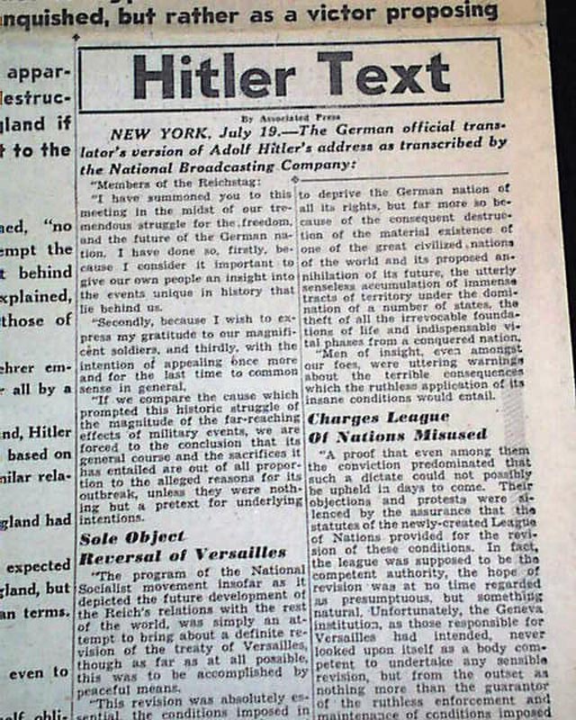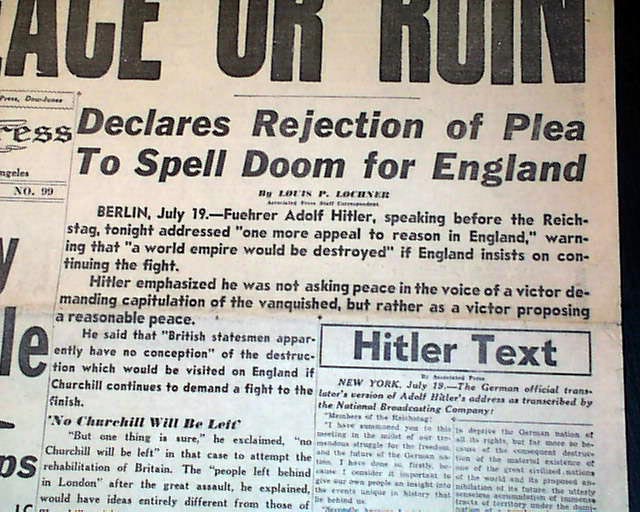The front page has a nice banner headline above the masthead: "HITLER TELLS BRITAIN TAKE PEACE OR RUIN" with subheads. (see)