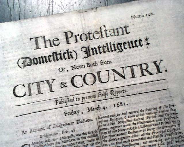 THE PROTESTANT (DOMESTICK) INTELLIGENCE, OR NEWS BOTH FROM CITY AND COUNTRY, London, England, March 4, 1681 Here is a rare opportunity to purchase a newspaper by Benjamin Harris. Harris was the first newspaper publisher in the colonies, having published "Public Occurrences Both Forreign & Domestick" in Boston in 1690. It lasted for only one issue.