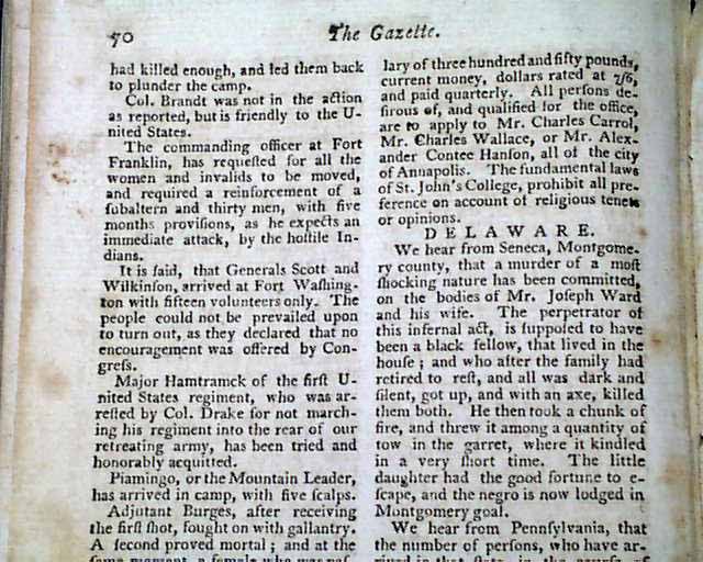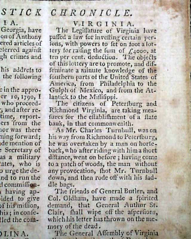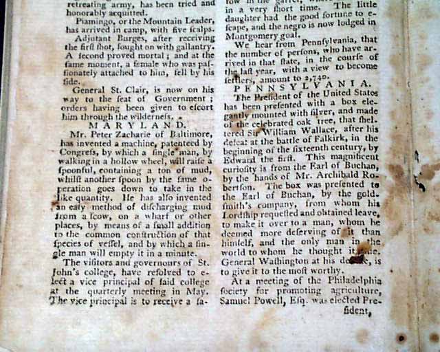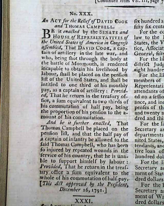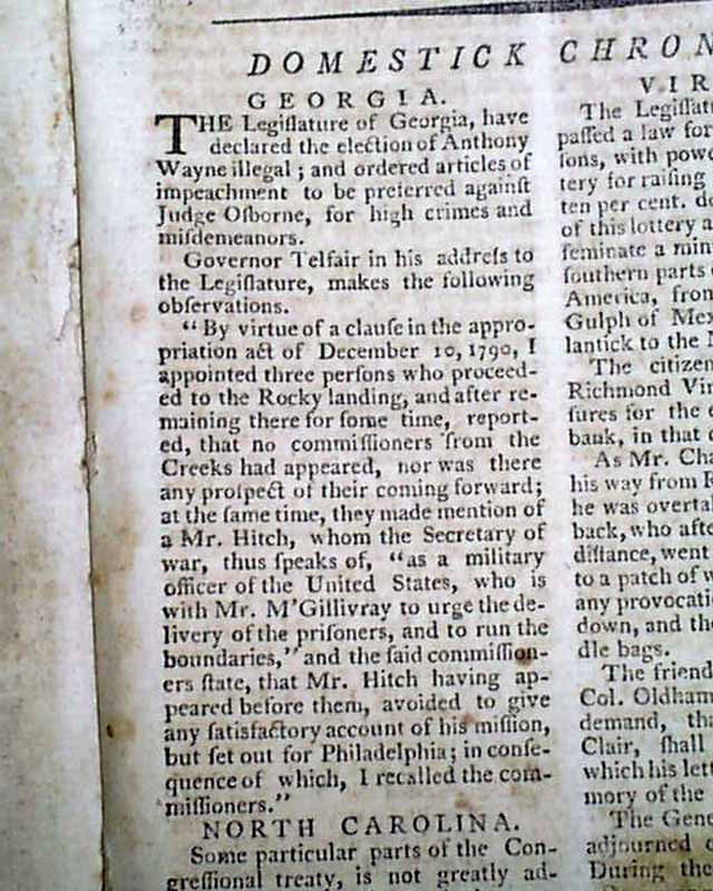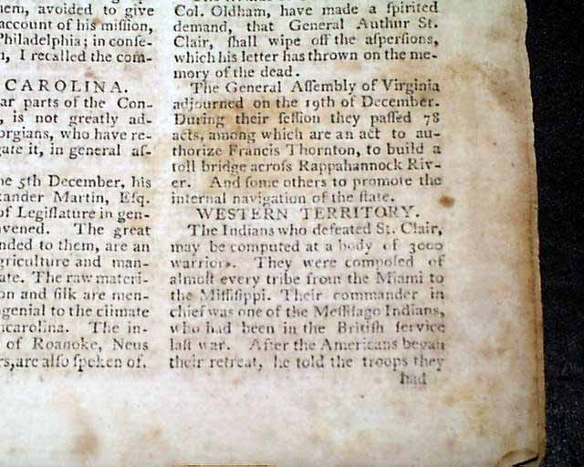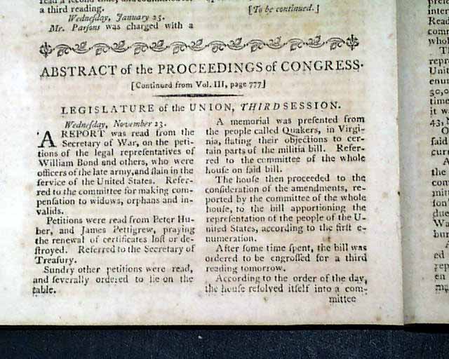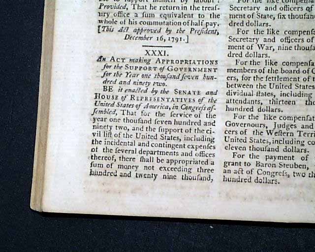 Near the back is a: "Collection of Publick Acts Papers, etc." including 3 Acts of Congress, each noted as: "Approved by the President...", and also: "Abstract of the Proceedings of Congress" taking several pages. Then: "Domestick Chronicle" with news of the day, state-by-state and which includes much on Indian troubles.