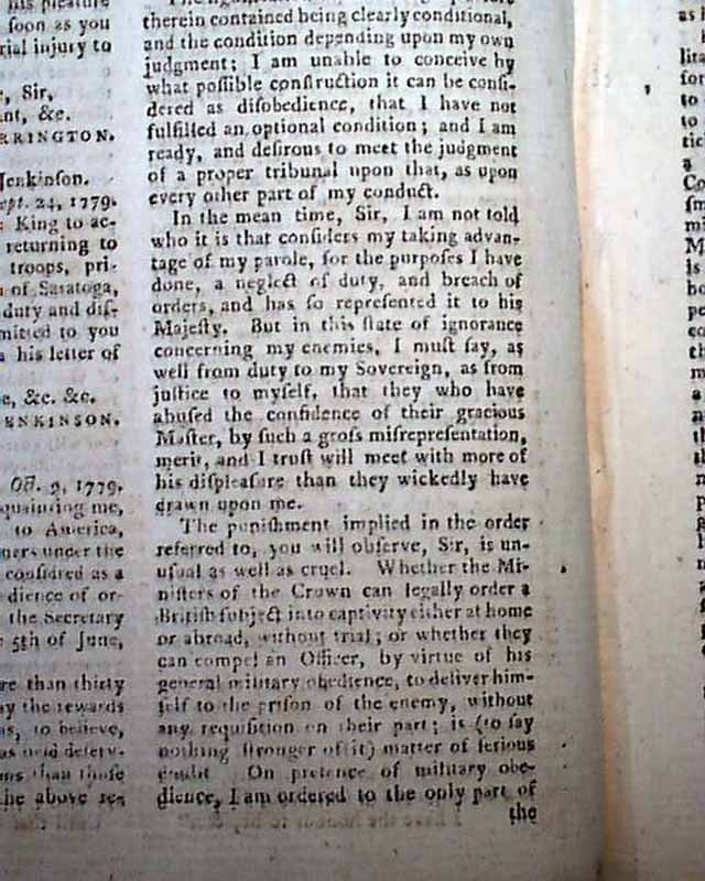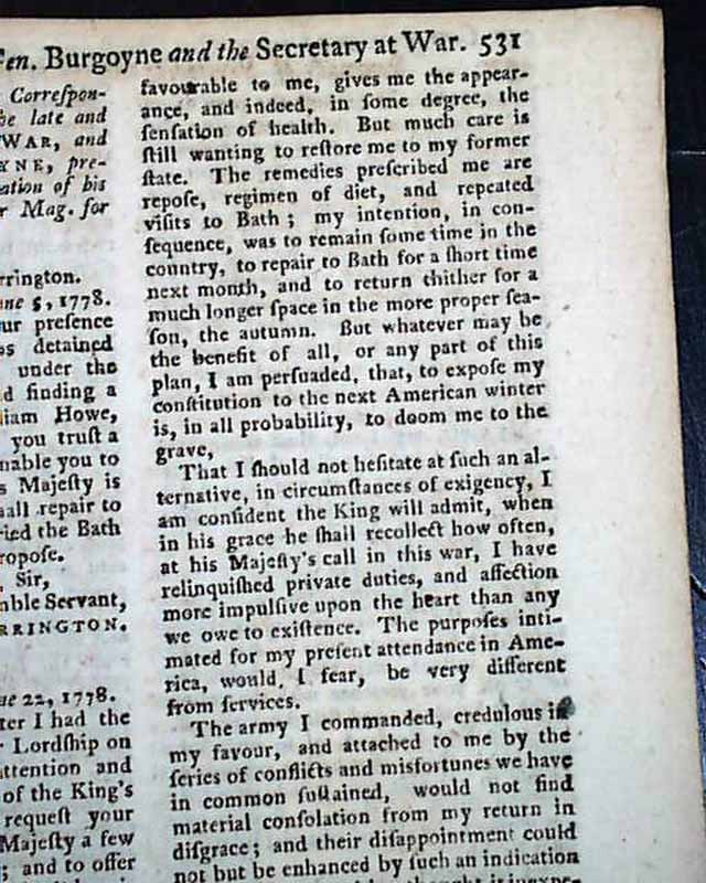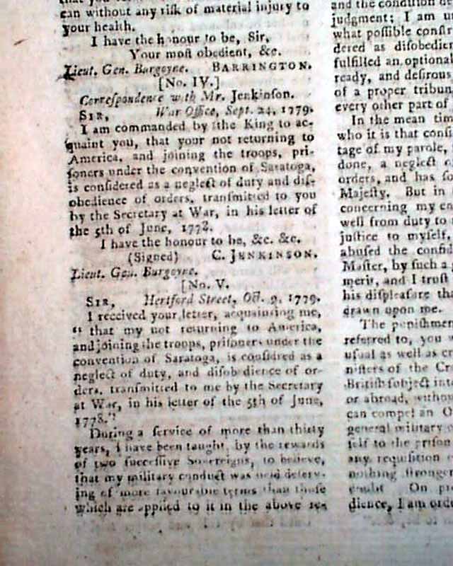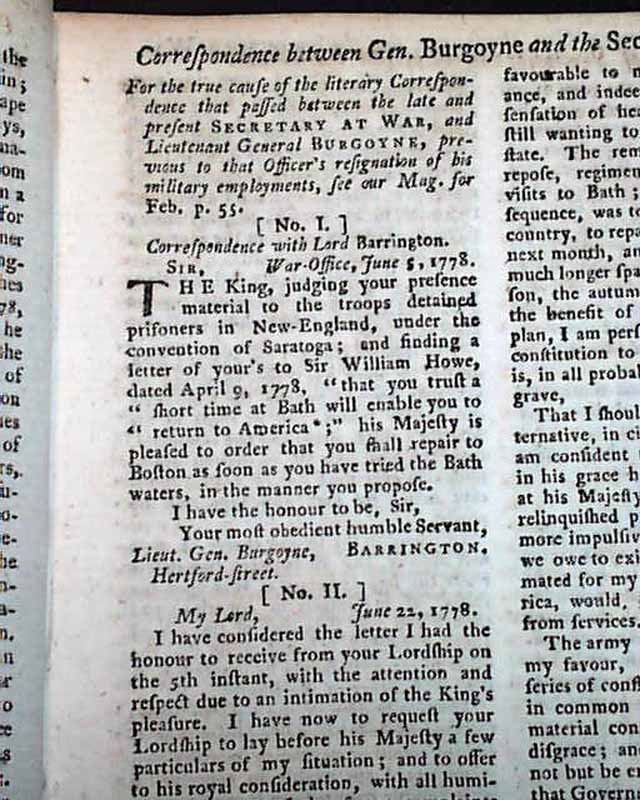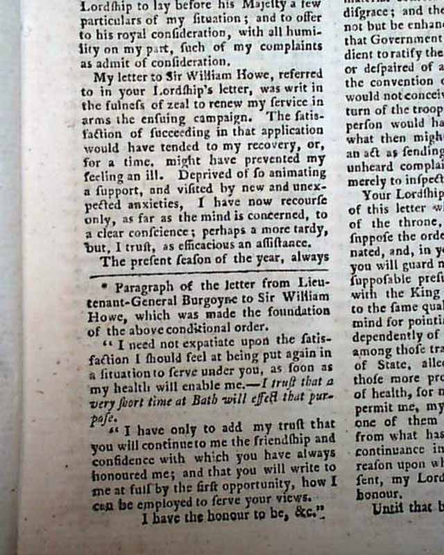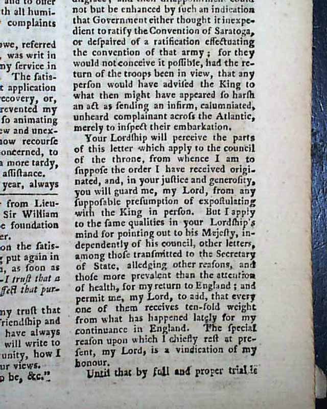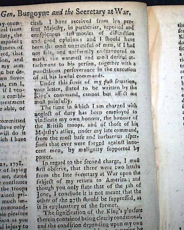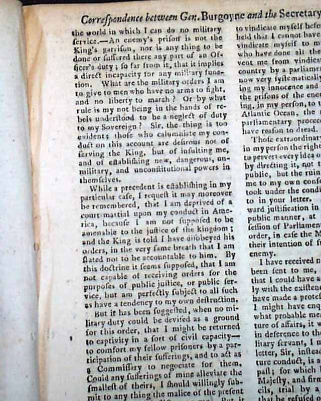 But the prime content would be the excellent coverage of events relating to General Burgoyne & his defeat at Saratoga, taking several pages & includes: "...The army I commanded, credulous in my favour, and attached to me by the series of conflicts & misfortunes we have in common sustained, would not find material consolation from my return in disgrace...indication that government either thought it inexpedient to ratify the Convention of Saratoga, or despaired of a ratification effectuating the convention of that army for they would not conceive it possible had the return of the troops been in view..." with much more.