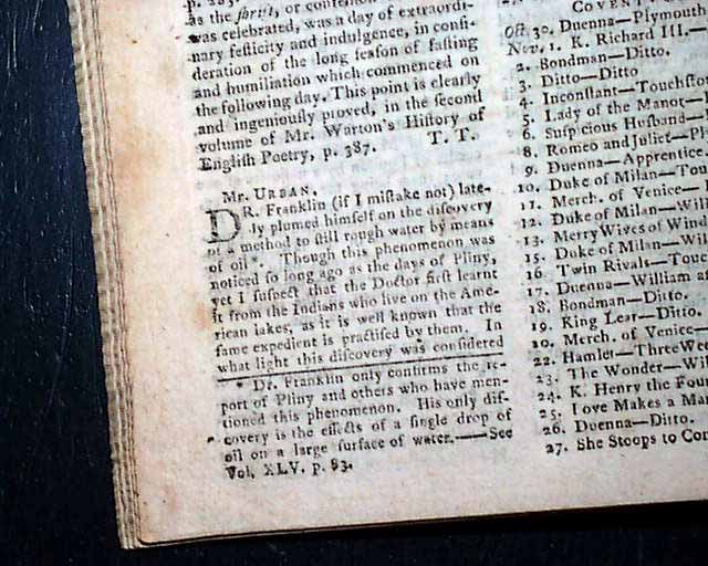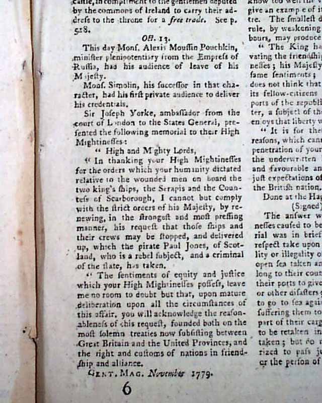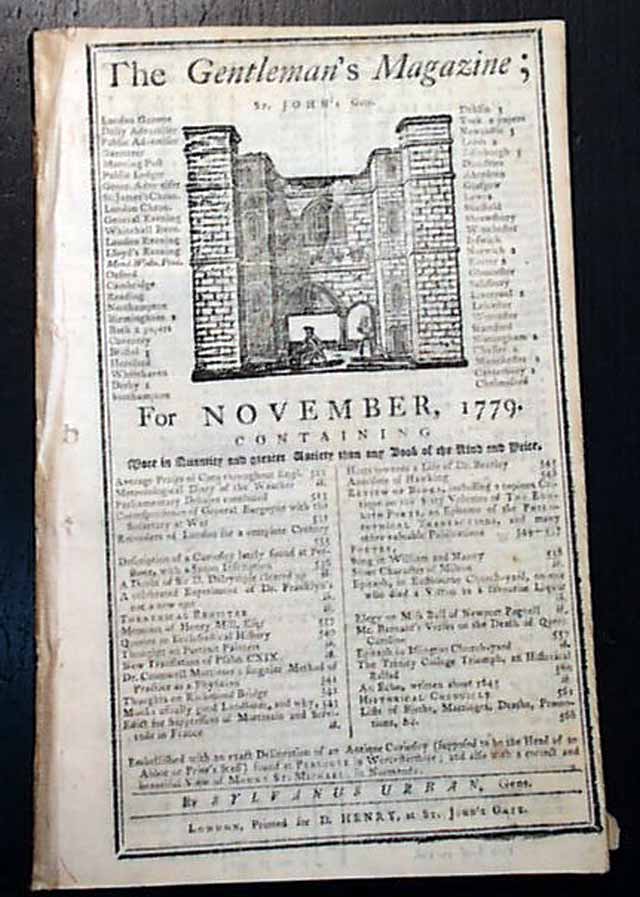 Item # 685882 GENTLEMAN'S MAGAZINE, London, November, 1779 The first 8 pages are taken up with "Summary of Proceedings in the Present Parliament" which includes some discussion of the affairs in America.
