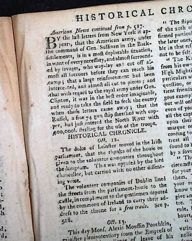 The 'Historical Chronicle" as some items on the Revolutionary War, noting; "...the American army, under the command of Gen. Sullivan in the Back settlements, is in a most deplorable situation, in want of every necessary & almost surrounded by savages...a large reinforcement had been intercepted & almost all cut to pieces, & that with regard to the royal army under Gen. Clinton, it was in the best order imaginable & ready to take the field to seek the enemy...".