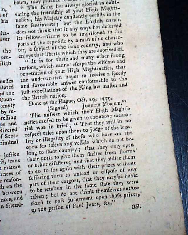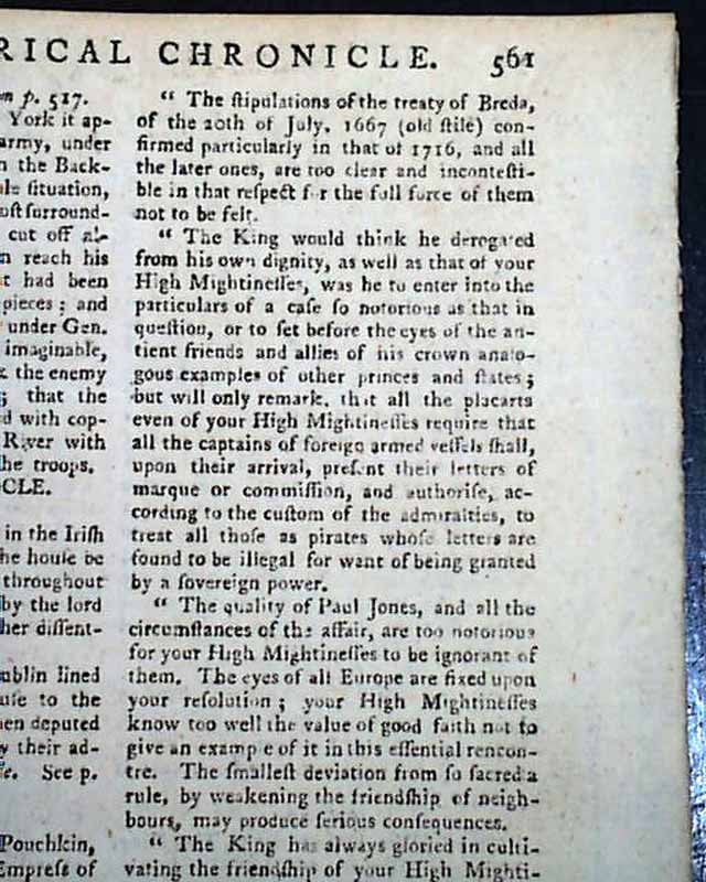There is also a great report concerning John Paul Jones and his battle with the Serapis: "...your humanity dictated relative to the wounded men on board the two king's ships, the Serapis and the Countess of Scarborough...comply with the strict orders of his Majesty his request that those ships and their crews may be stopped, & delivered up, which the pirate Paul Jones, of Scotland, who is a rebel subject, & a criminal of the state, has taken..." and a bit further on: "...to treat all those as pirates whose letters are found to be illegal for want of being granted by a sovereign power. The quality of Paul Jones, and all the circumstances of the affair, are too notorious for your High Mightinesses to be ignorant of them..." with more.
