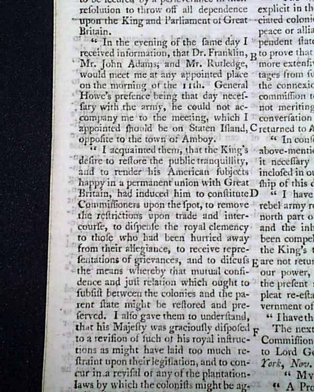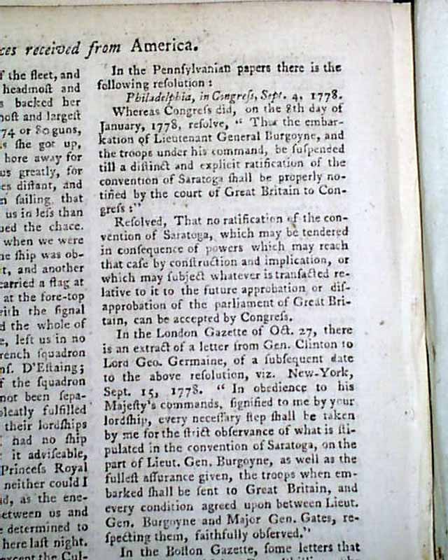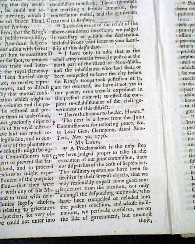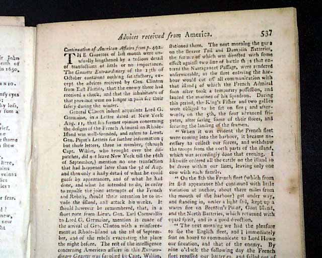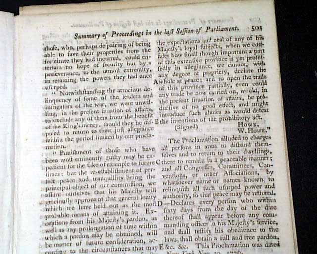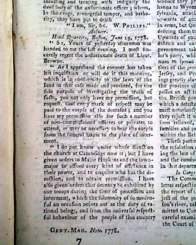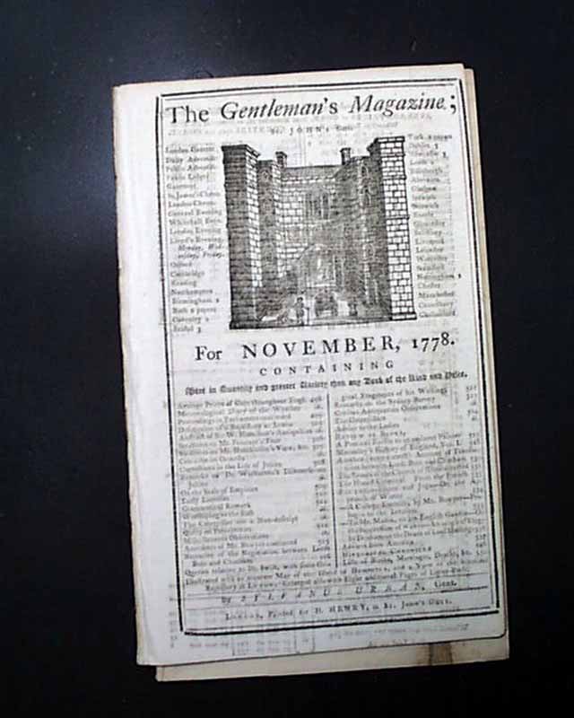 THE GENTLEMAN'S MAGAZINE, London, November, 1778 The issue begins with: "Proceedings in Parliament, continued" which has much concerning the Revolutionary War, including letters from Lord Viscount Howe to Lord Germaine from New York signed by him in type.A few bits include: "...as the rebel army remain strongly posted at the north part of the island of New York & the inhabitants who had fled...we have it not yet in our power...to effect the compleat re-establishment of the civil government of this district." and "...considerable numbers of the inhabitants of the city & county of New York...attesting their allegiance to the King & their submission to the constitutional authority of Great Britain, & praying to be restored to the peace of his Majesty..." and so much more.