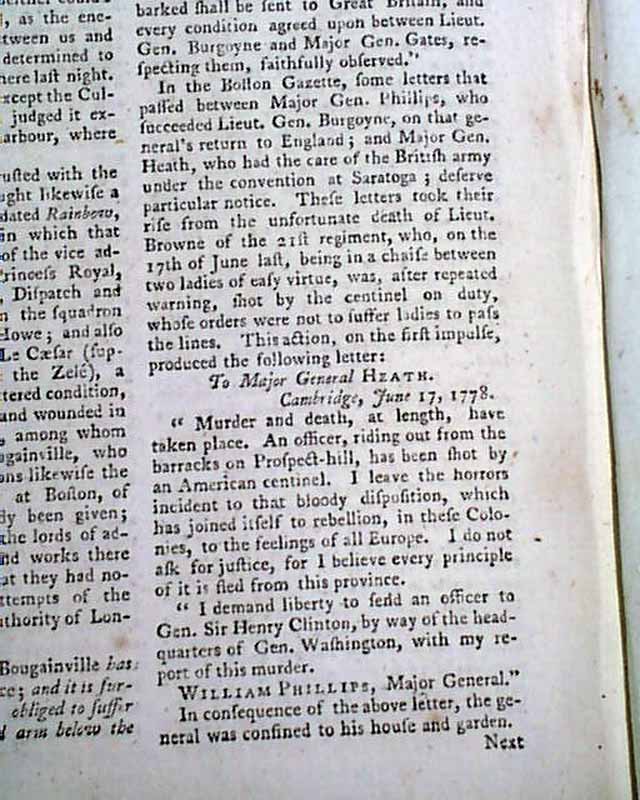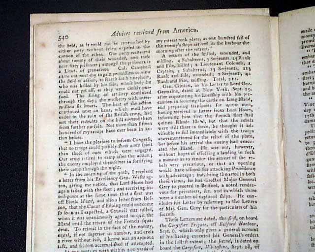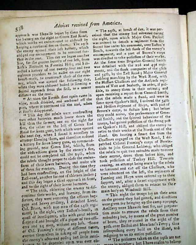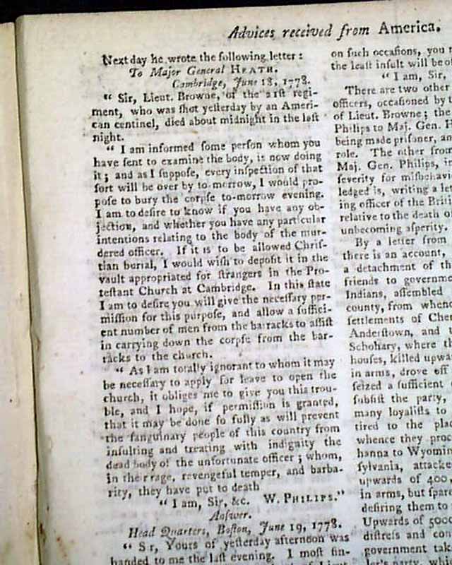 Further on is: "Advices Received from America" which has much on the Revolutionary War and takes over 9 pages with far too much war-related content to note here, plus the photos only show small portions. But some bits include much on reports on the Americans' attempt to take Newport, Rhode Island, back from the British; a letter to Major General Heath from Cambridge beginning: "Murder & death, at length, have taken place. An officer, riding out from the barracks on Prospect Hill, has been shot by an American centinel...I demand liberty to send an officer to Gen. Sir Henry Clinton, by way of the headquarters of Gen. Washington, with my report of this murder." with more; also some text on the Cherry Valley skirmish; and even more.