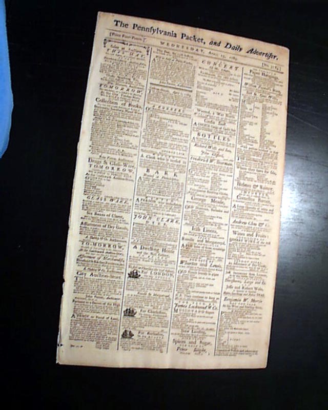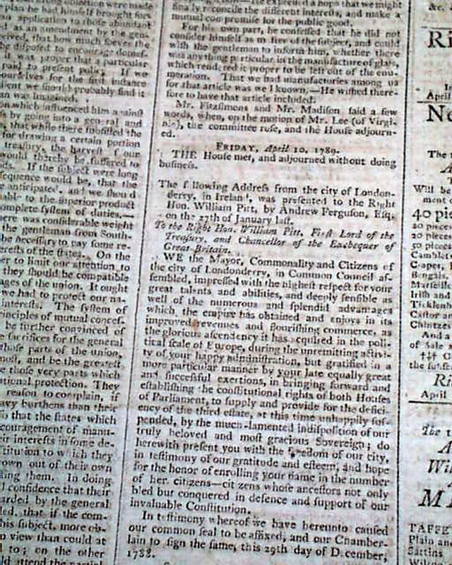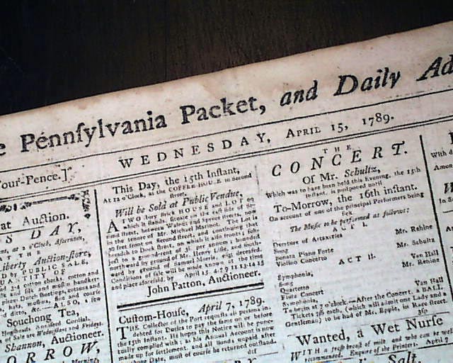 PENNSYLVANIA PACKET & DAILY ADVERTISER, Philadelphia, April 15, 1789  A terrific issue on the very first days of work for the new federal Congress. An item notes that: "...were appointed a committee to meet a committee of the Senate, in order to form rules for the conducting of conferences and for the transaction of business between the two houses...".