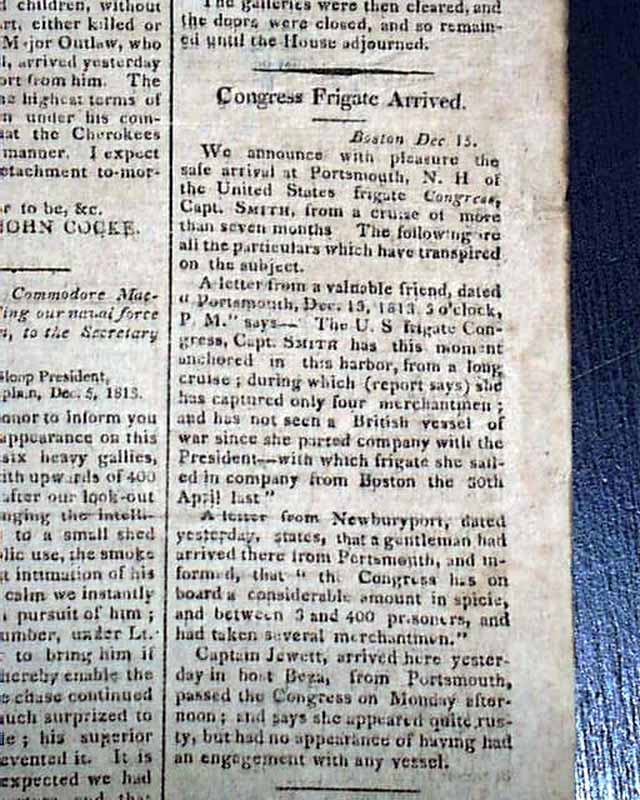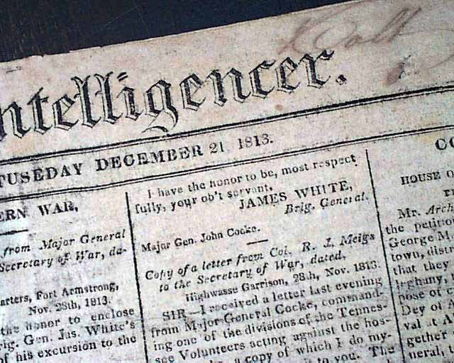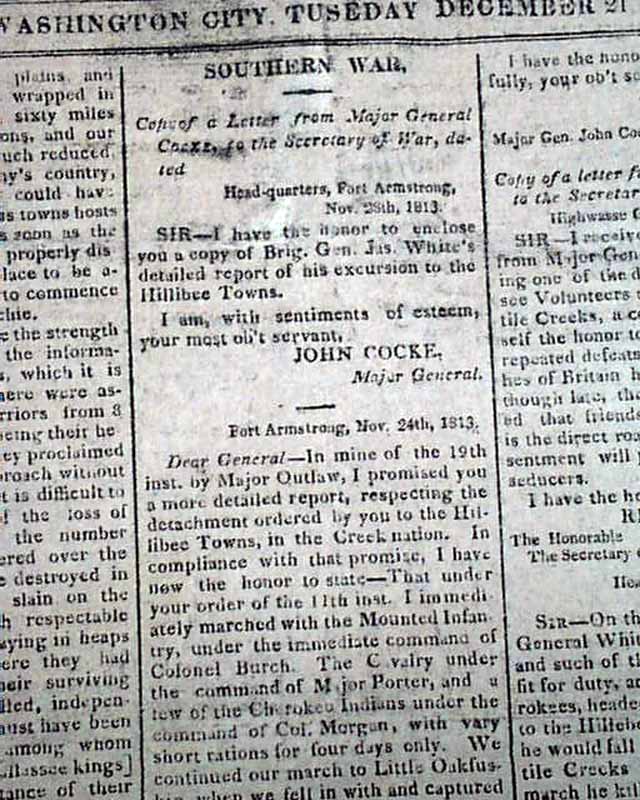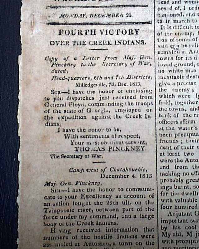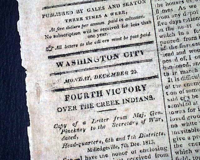 NATIONAL INTELLIGENCER, Washington City, Dec. 21, 1813 The front page has 2 columns taken up with: "Fourth Victory Over The Creek Indians". Also on the ftpg: "Southern War" "Copy of a Letter from Comm. MacDonough, commanding our Naval Force on Lake Champlain, to the Sec. of the Navy" "Congress Frigate Arrived" and more.