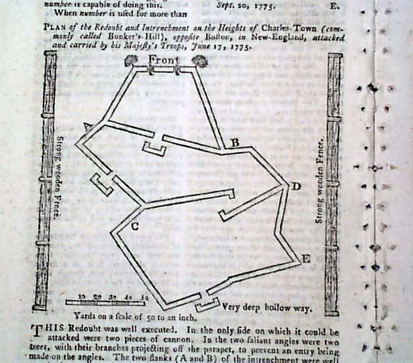 Perhaps the best content is the very nice half page illustration of the "Redoubt & Intrenchment on the Heights of Charles Town, Commonly called Bunker Hill, Opposite Boston, attacked & Carried by his Majesty's Troops, June 17, 1775" with some text on the illustration as well. A great graphic relating to the Battle of Bunker Hill.